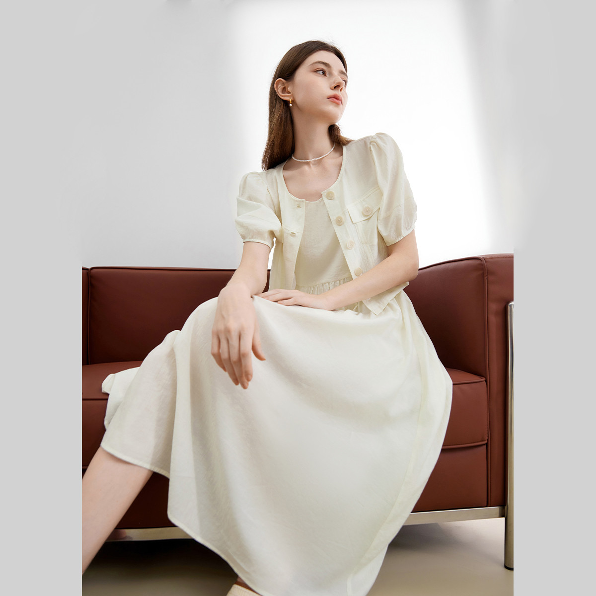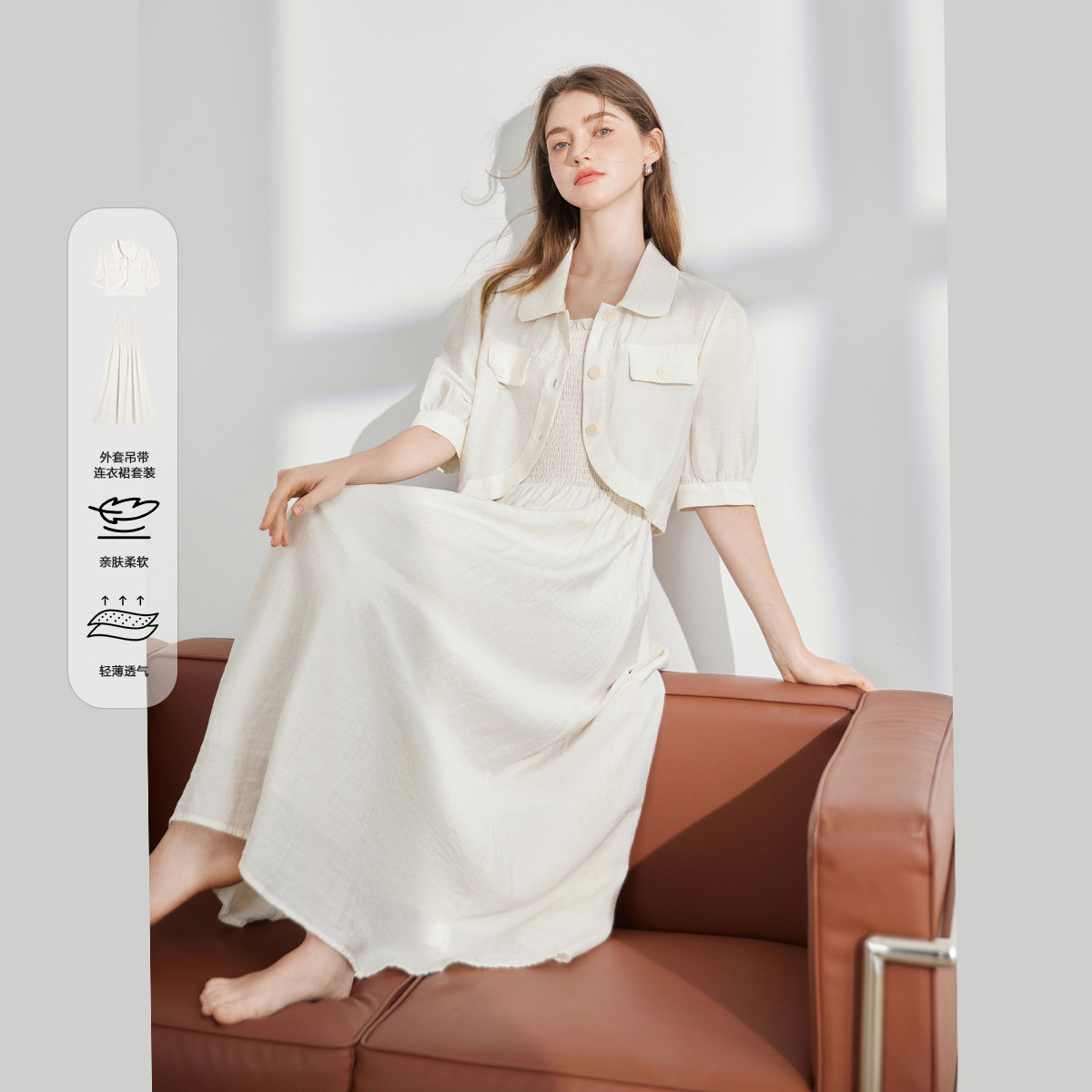 【2024夏季简约气质吊带连衣裙套装女度假风泡泡袖衬衫两件套 668244