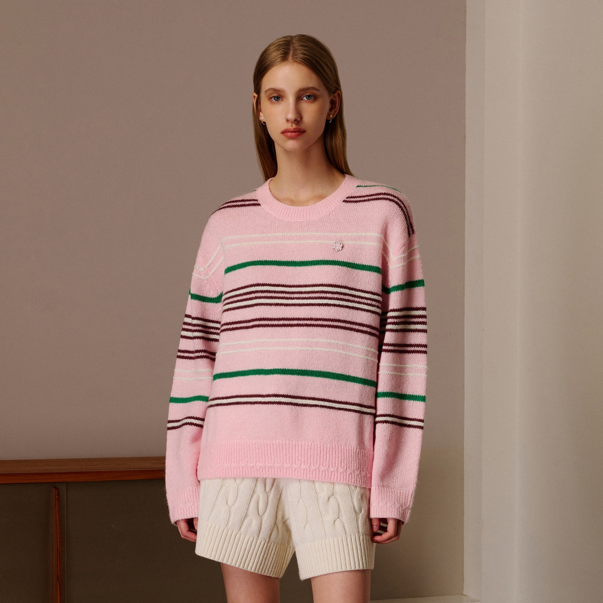 小熊春秋款粉色条纹套头毛衣针织衫慵懒风内搭毛衫女 123329