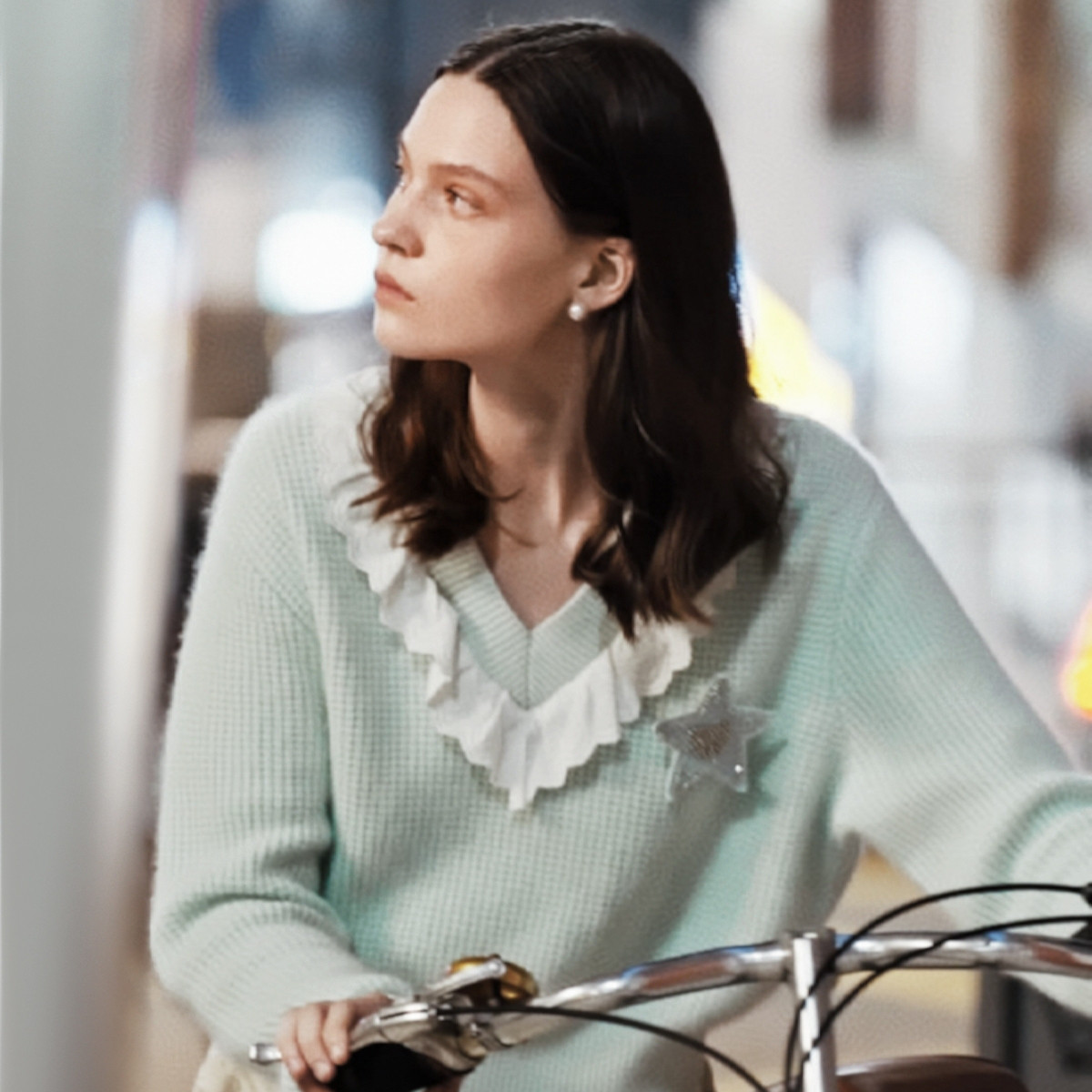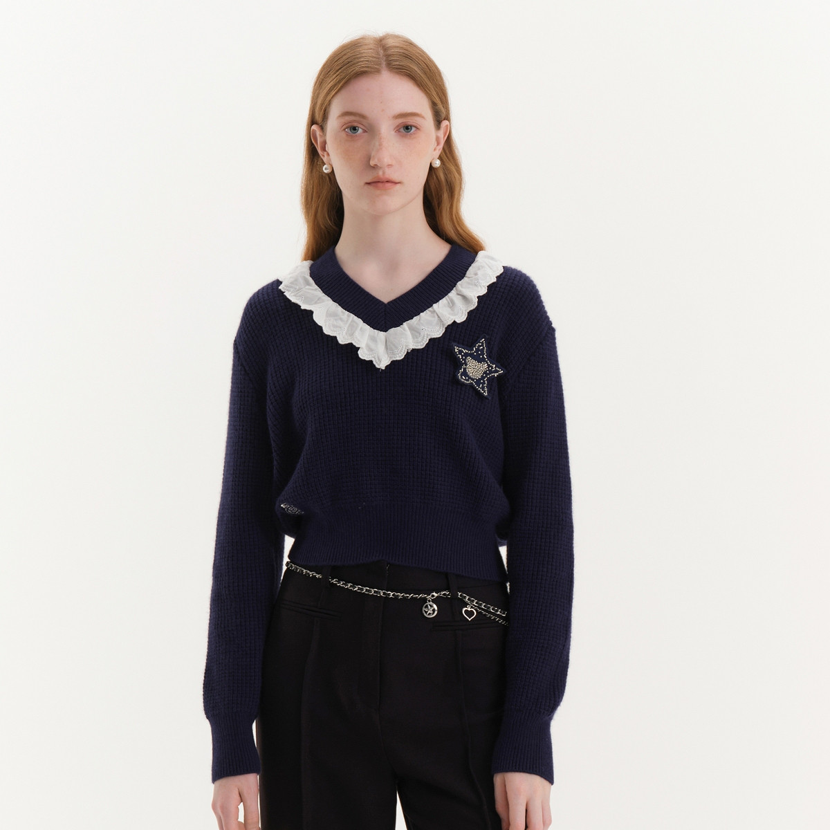 小熊春秋款蕾丝边撞色V领套头衫毛衣针织衫女士 909377