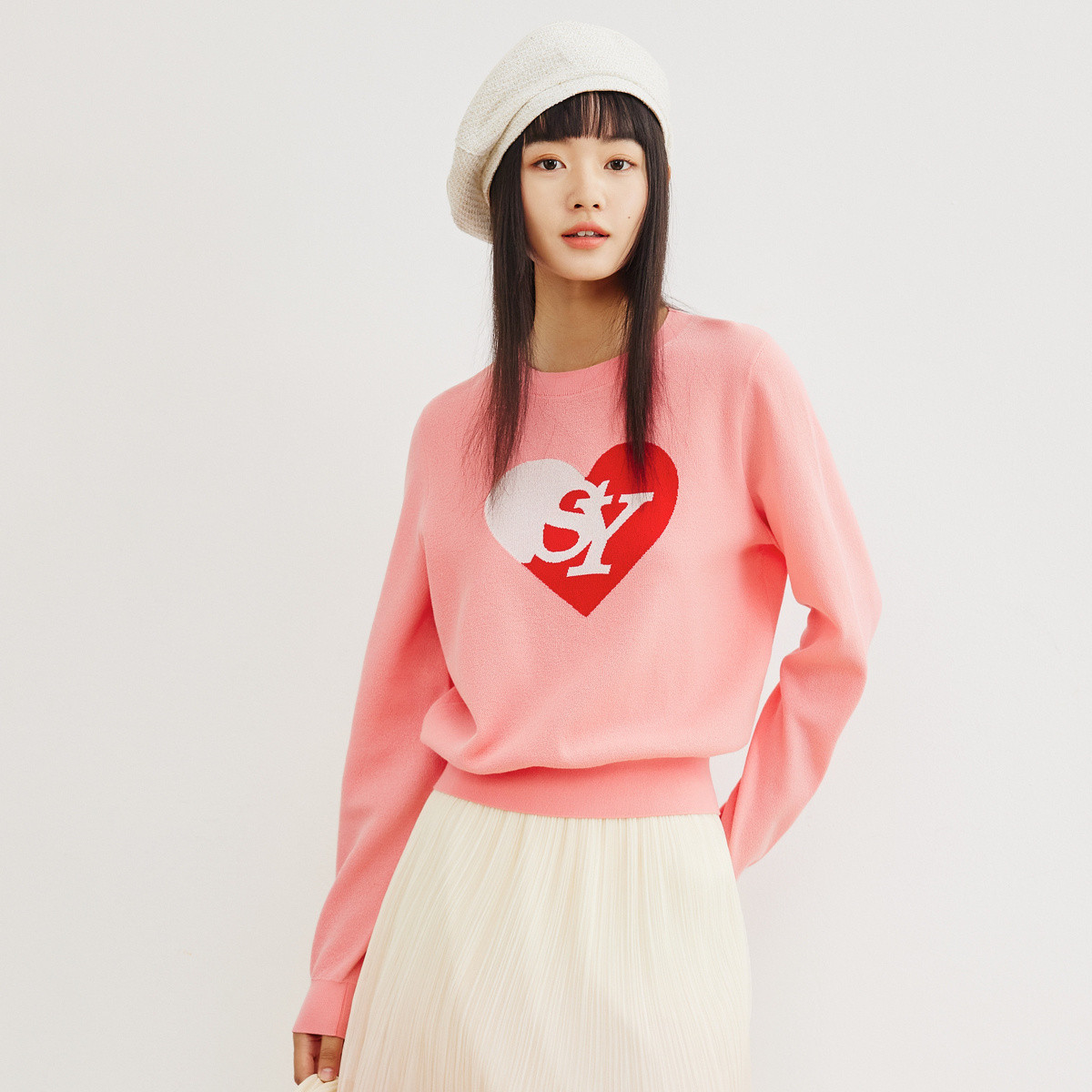 百搭减龄粉色爱心套头毛衣女春秋休闲时尚柔软舒适针织卫衣女 610371