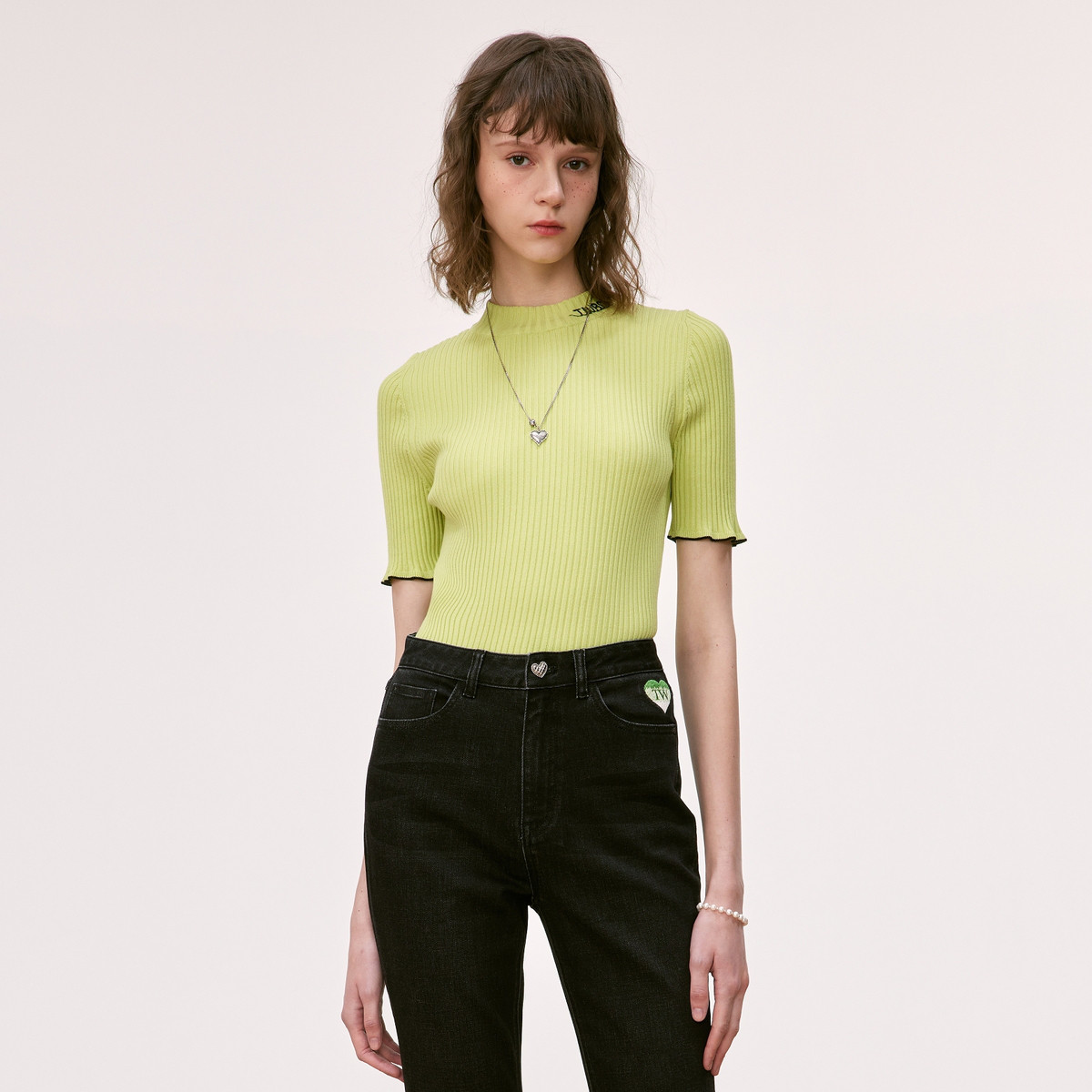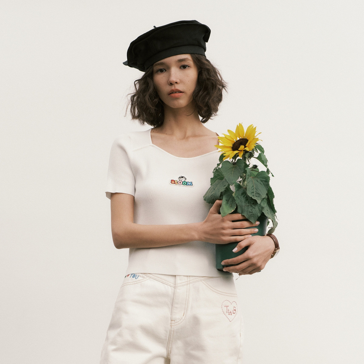 小熊V领变型弧度短款毛衣薄款针织T恤短袖修身女 113473