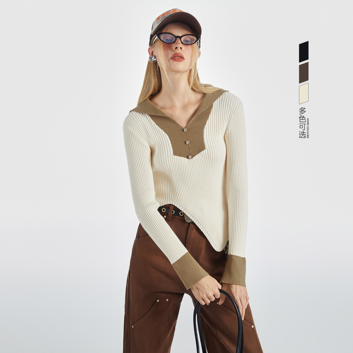不规则下摆春秋慵懒高级感polo领毛衣女小众长袖上衣 896468
