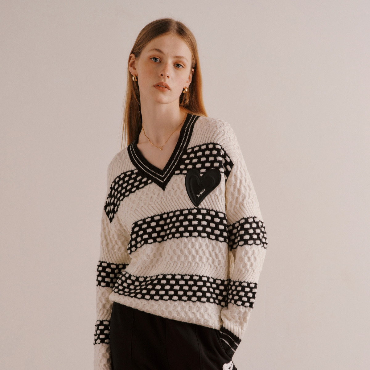小熊春秋款毛衣女V领条纹撞色套头针织衫学院风女 687489