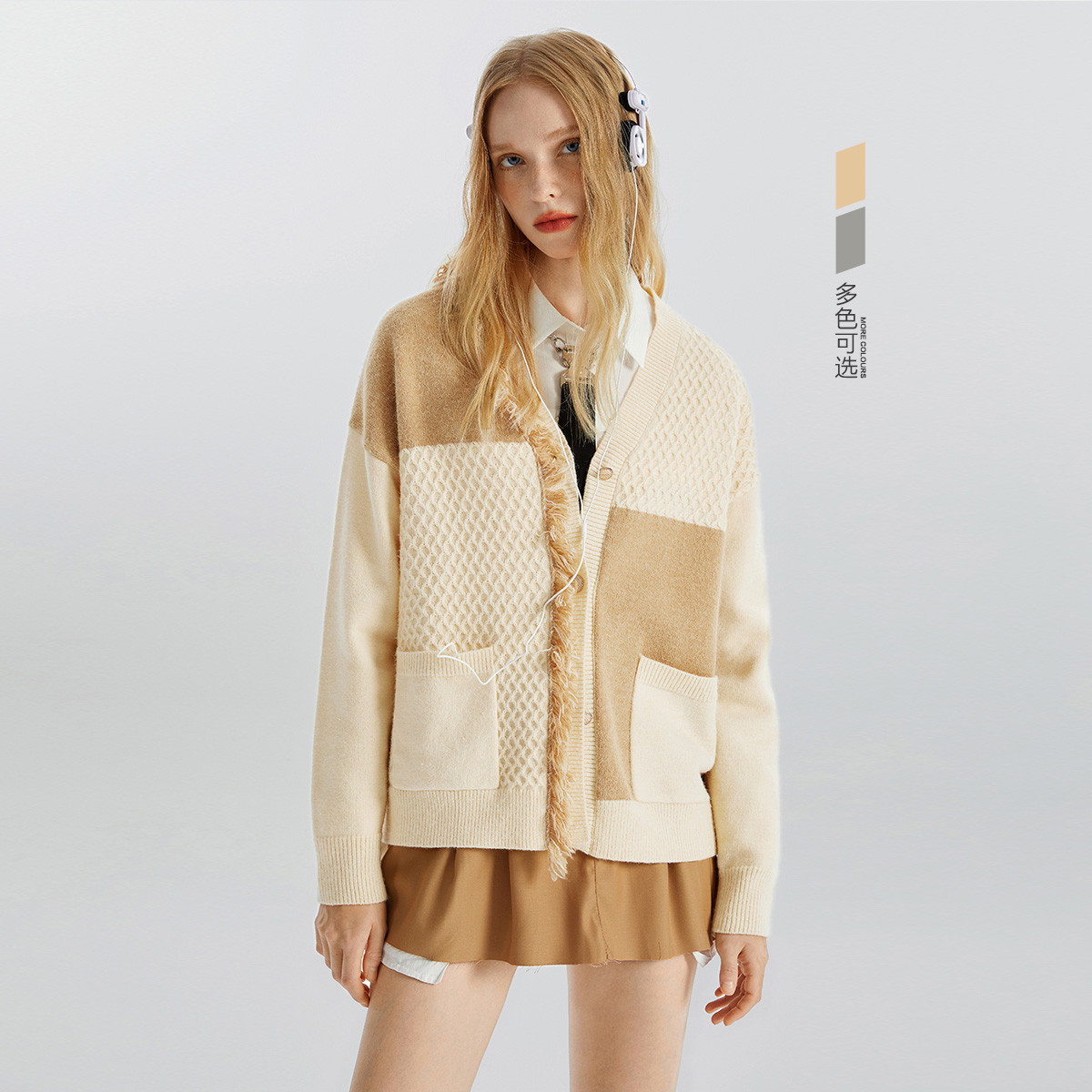 撞色拼接春秋日系慵懒复古毛衣女温柔针织长袖开衫上衣 812692