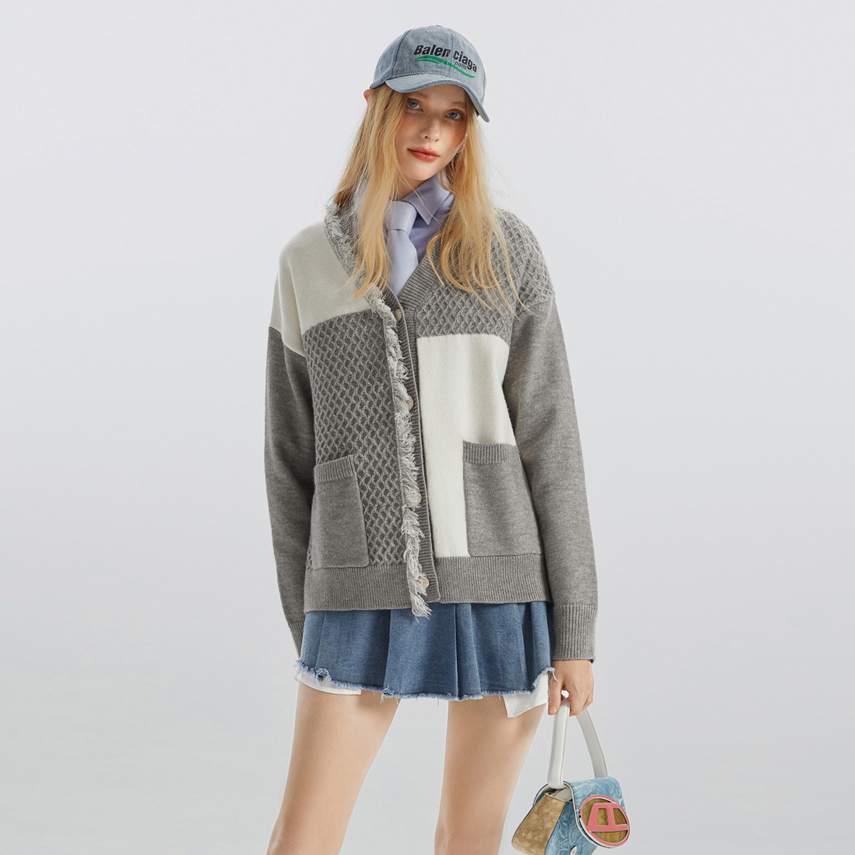 【100%绵羊毛】圆领提花针织衫女开衫简约百搭长袖毛衣外套 076179