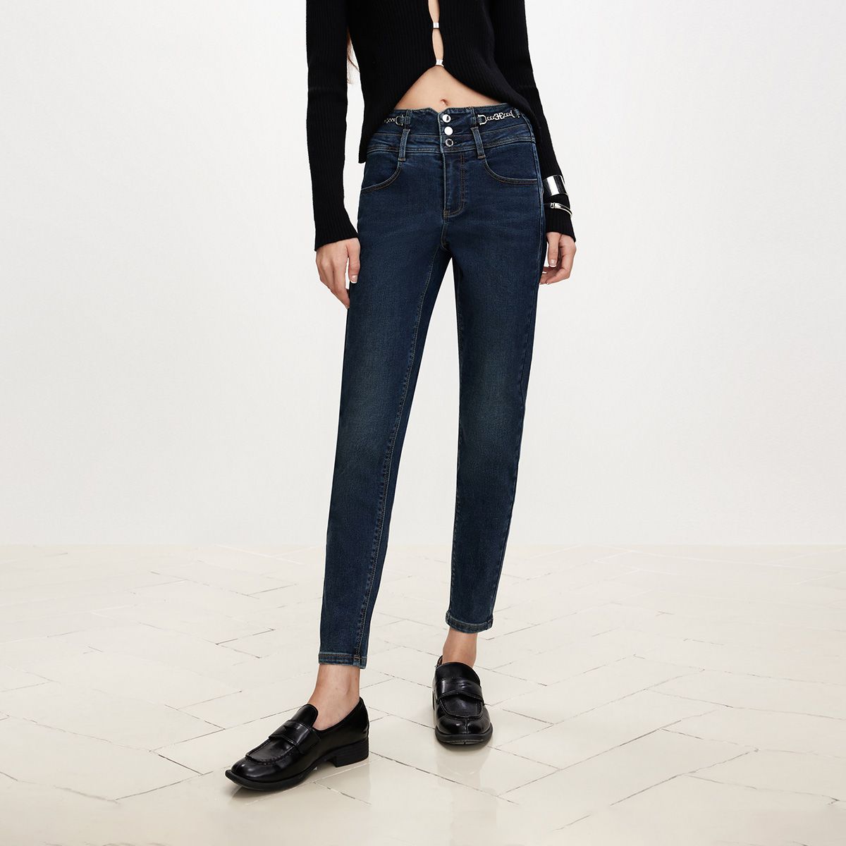 【深蓝九分牛仔裤】秋背后口袋撞色刺绣设计牛仔裤女 130498