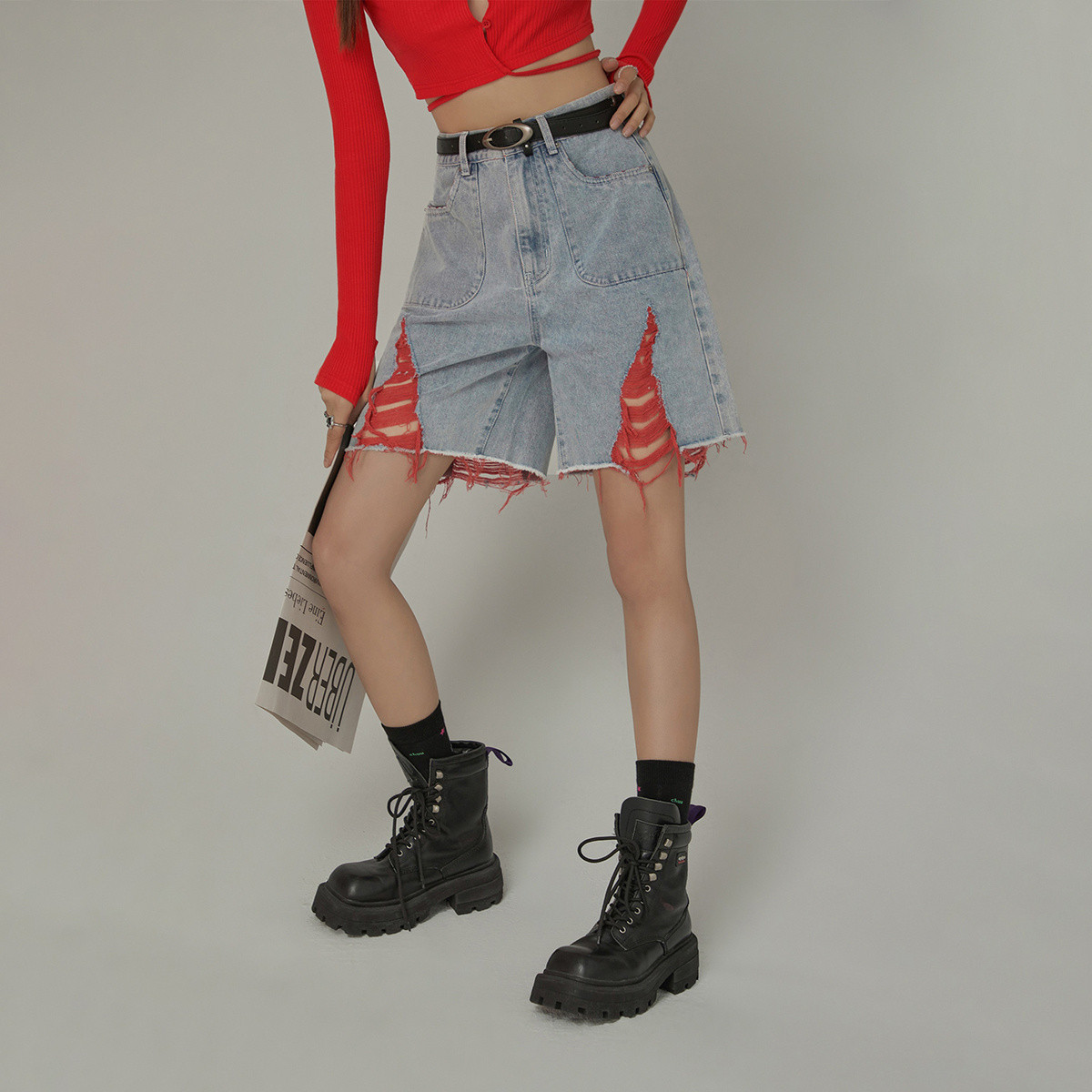 高腰磨破短款牛仔裤女2025夏不规则毛边破洞设计短裤 094995
