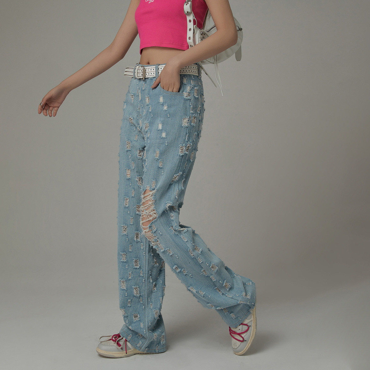 破洞阔腿牛仔裤女士夏辣妹高腰磨破拖地长裤子潮 464595