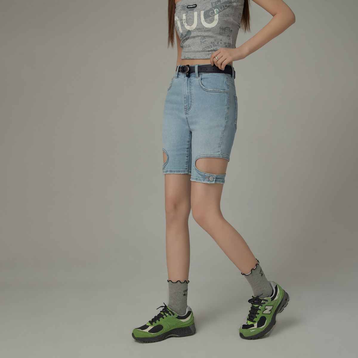 CHUU镂空磨破牛仔裤女士夏辣妹水洗浅色修身短裤 653011