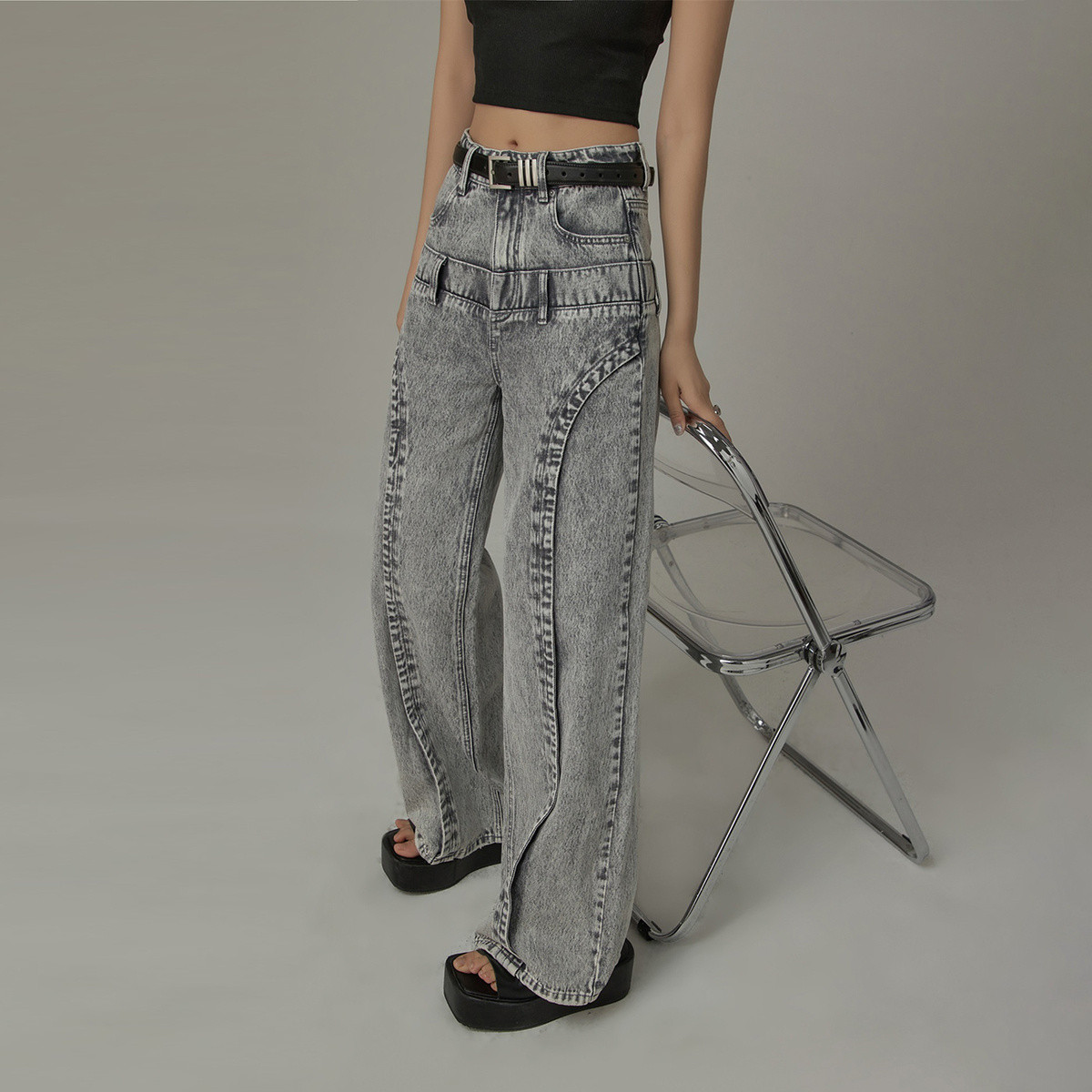 石磨水洗牛仔裤女夏个性双腰立体感直筒长裤 571091