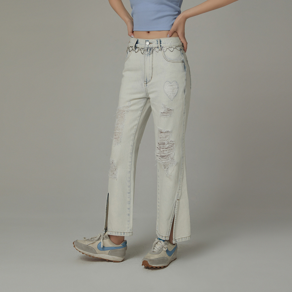 CHUU微喇牛仔裤女夏爱心破洞设计感开叉个性裤子 693971
