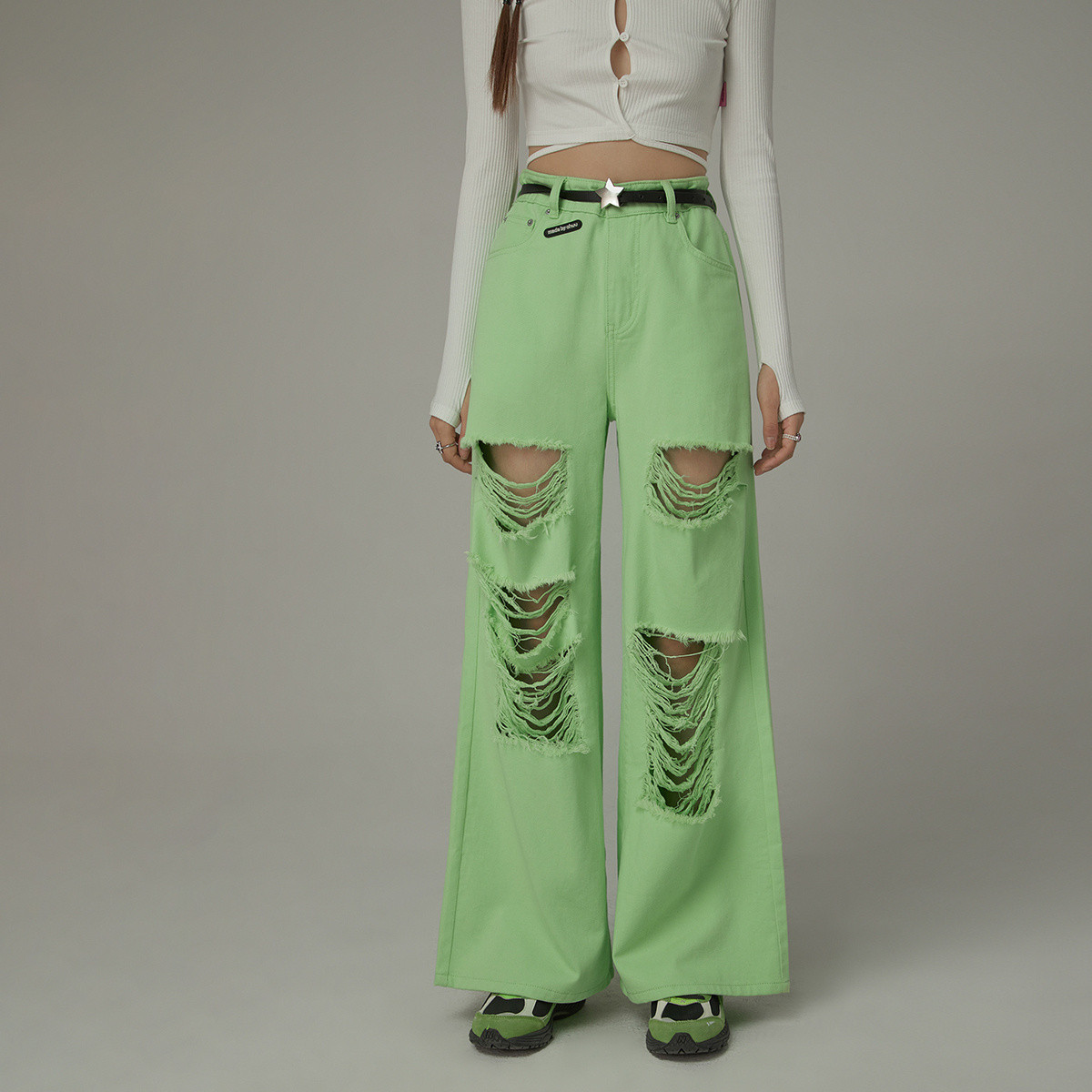 破洞阔腿牛仔裤女士夏辣妹纯色宽松直筒长裤子潮 017299