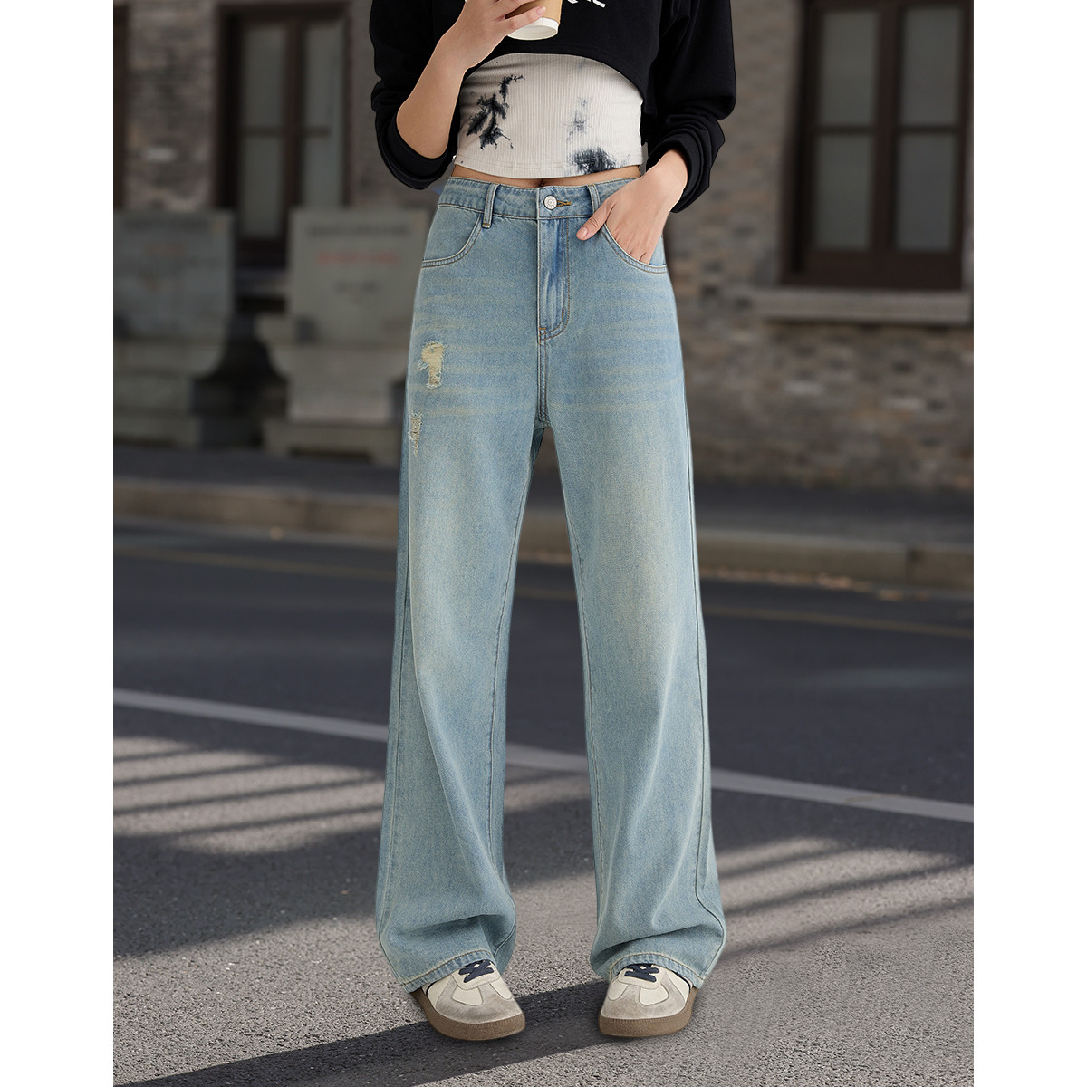 水洗磨白阔腿牛仔裤女春秋高腰褶皱宽松磨破长裤子 455571