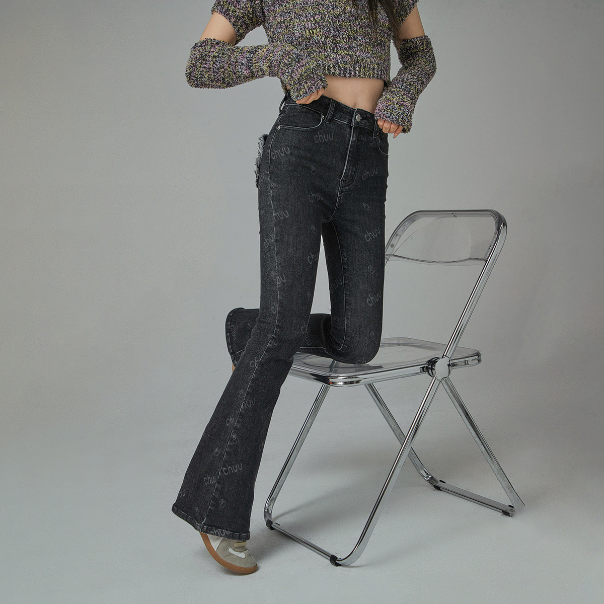 字母高腰牛仔裤女春秋设计感百搭微喇裤长裤子 354643