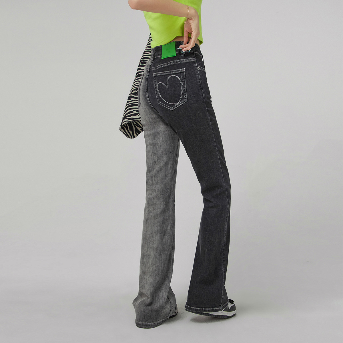 烟灰色撞色高腰微喇牛仔裤女春秋修身长裤子 608595