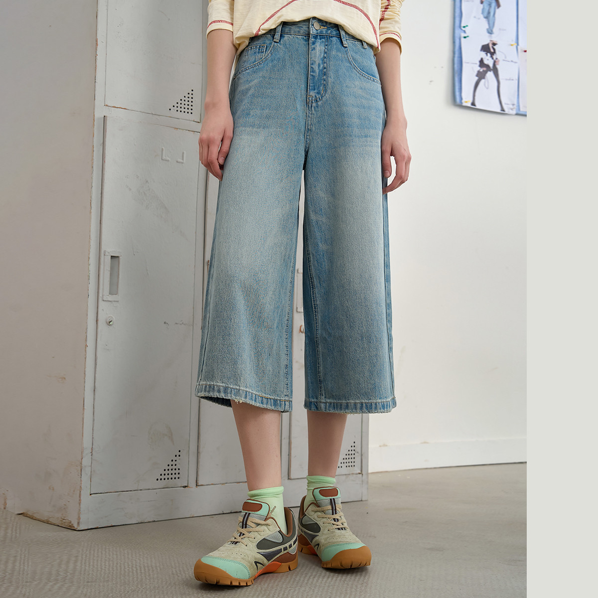 复古做旧宽松百搭休闲七分阔腿裤2025夏季高腰显瘦女式牛仔裤 450525