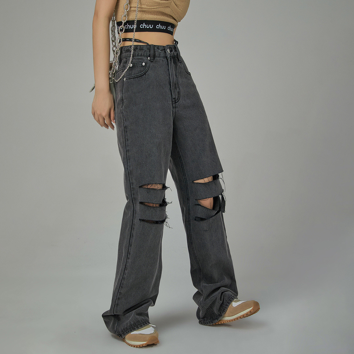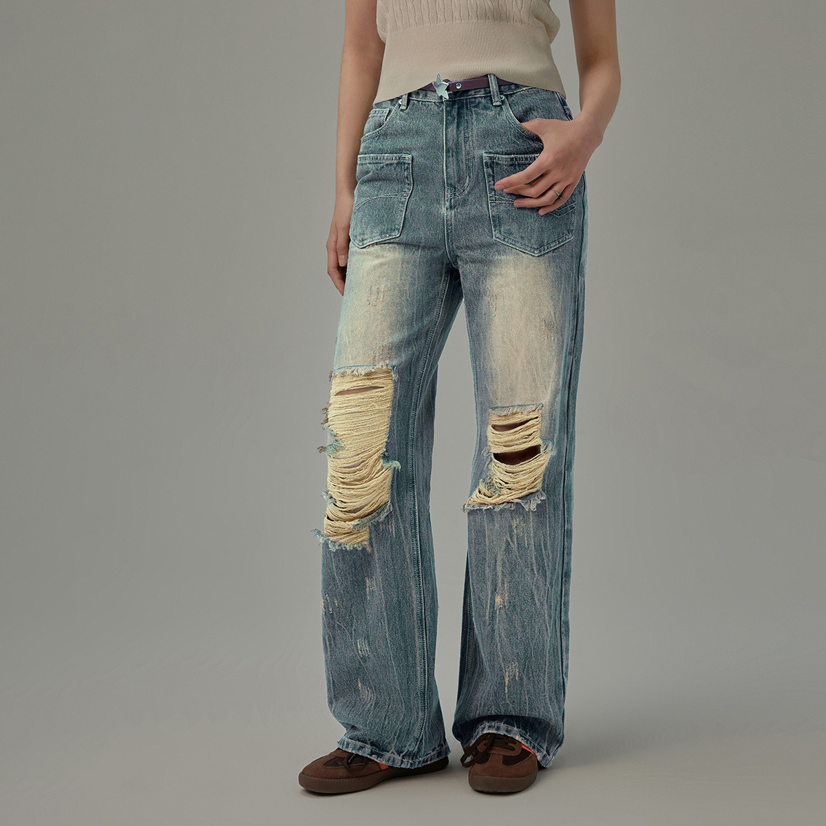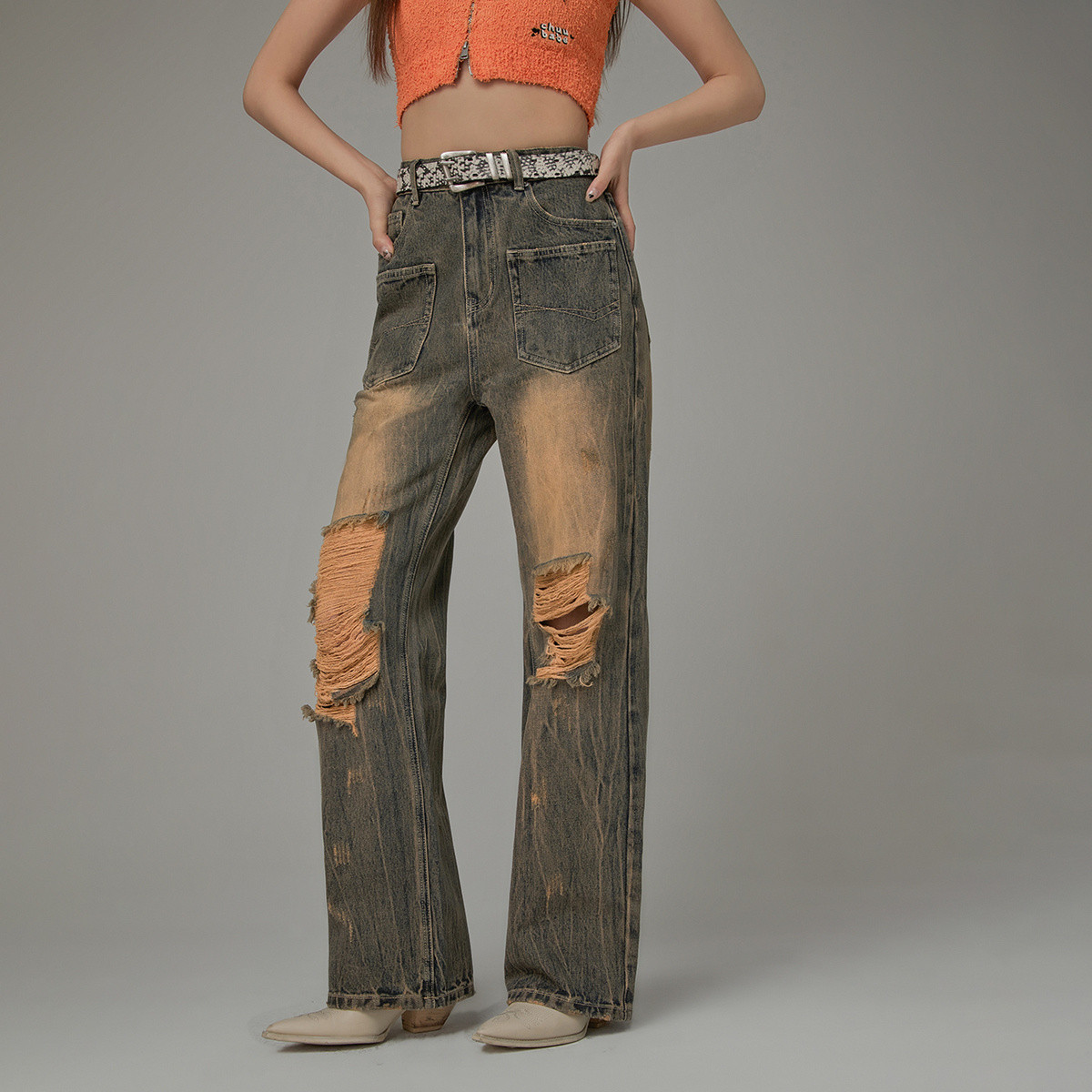 个性破洞牛仔裤女2025夏设计感口袋百搭辣妹直筒长裤 458259