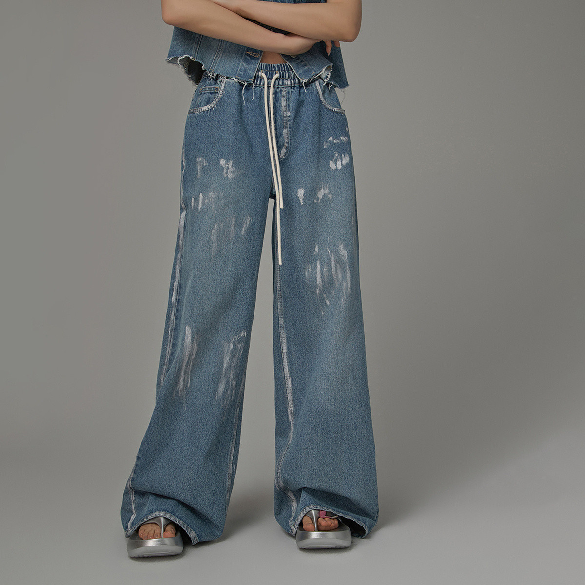 松紧腰系带阔腿牛仔裤女2025夏韩版漆点垂感宽松长裤子 513683