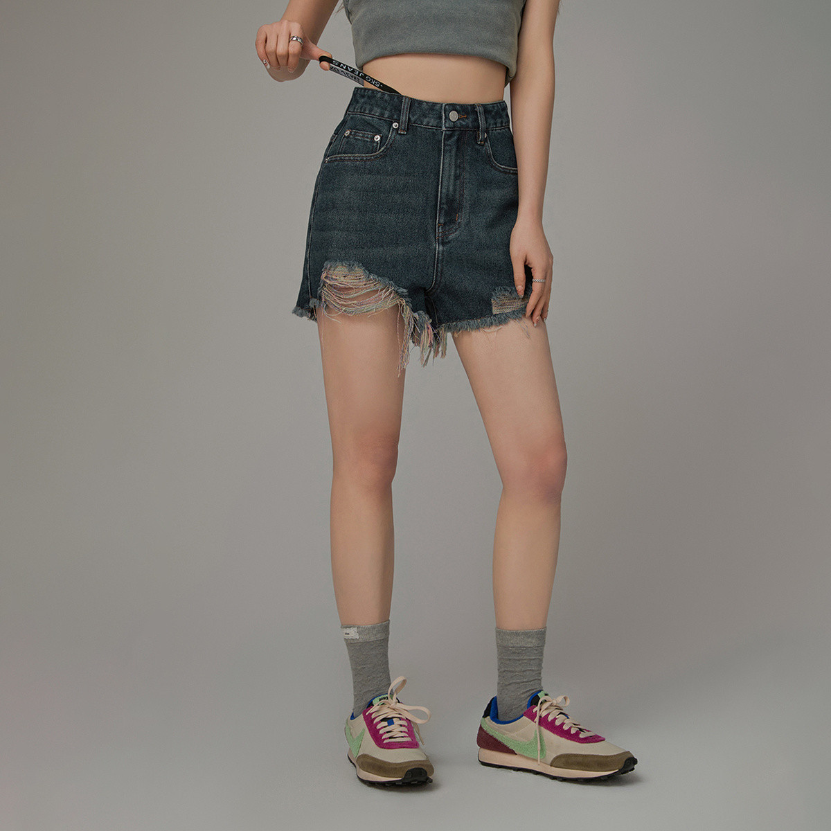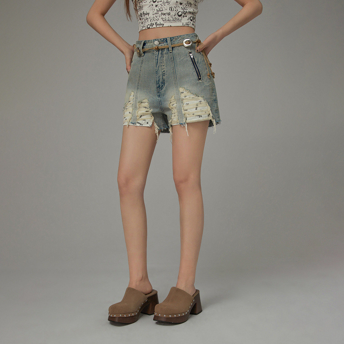 高腰磨破短款牛仔裤女2025夏不规则毛边破洞设计短裤 094995