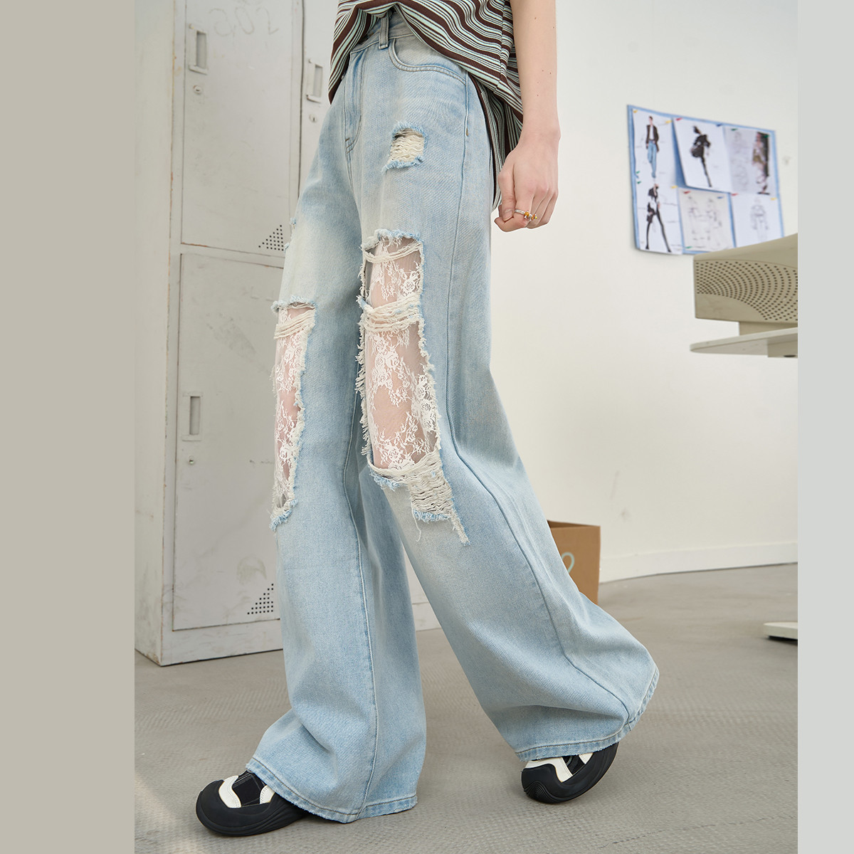 蕾丝拼接破洞宽松高腰阔腿裤2025夏季百搭休闲女式牛仔裤 496989