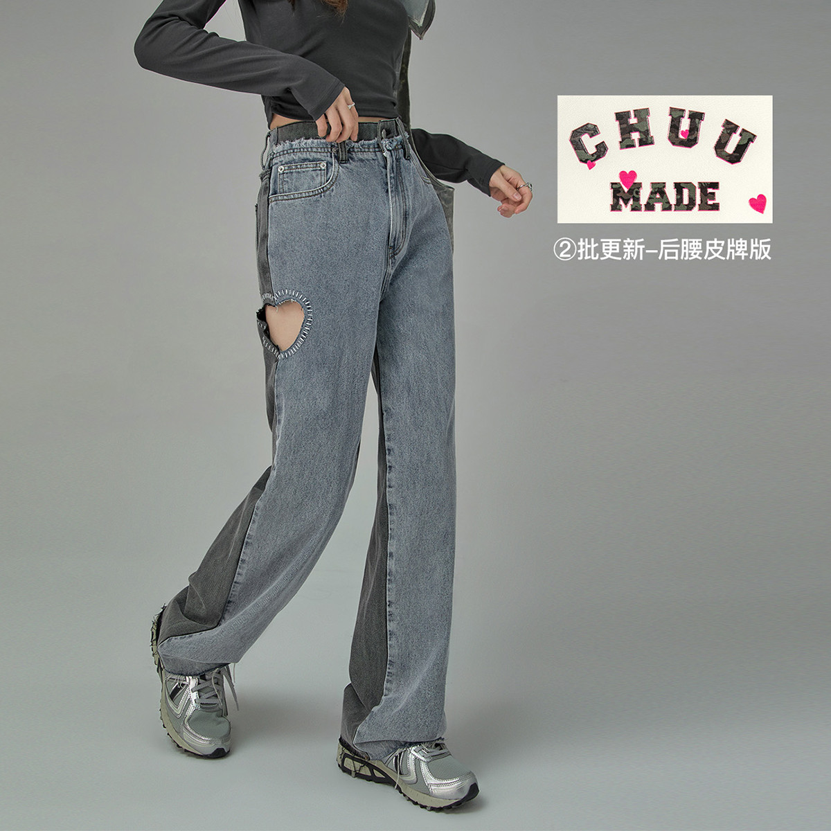 镂空爱心宽松牛仔裤女春秋季设计感小众拼色阔腿裤子 257747