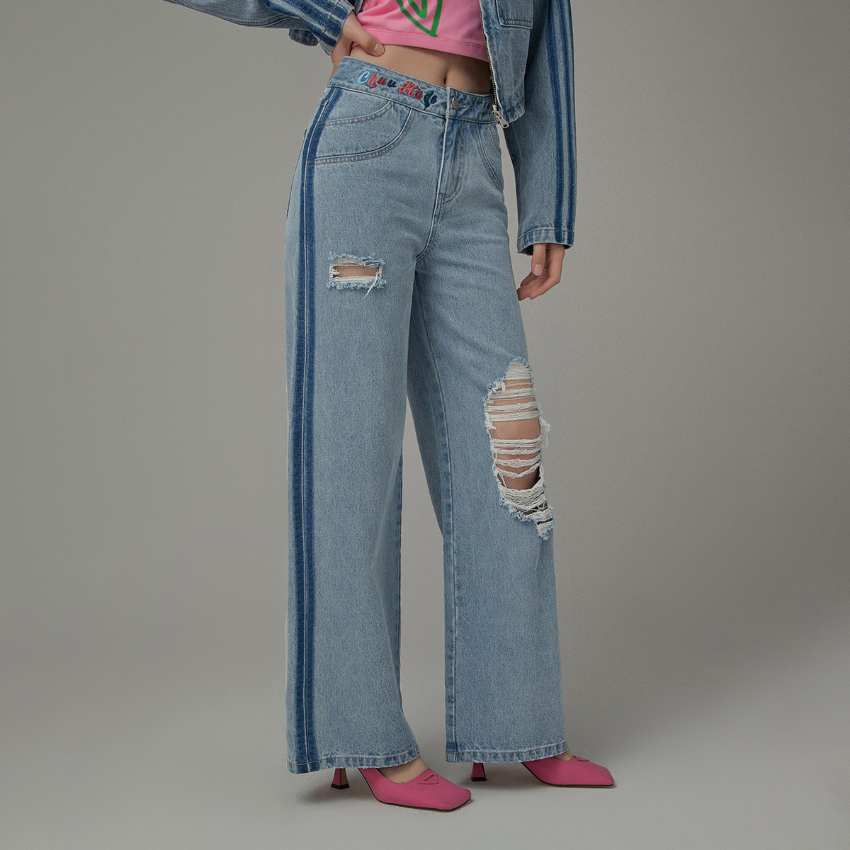 不对称破洞直筒牛仔裤女2025夏撞色字母刺绣侧条纹 444051
