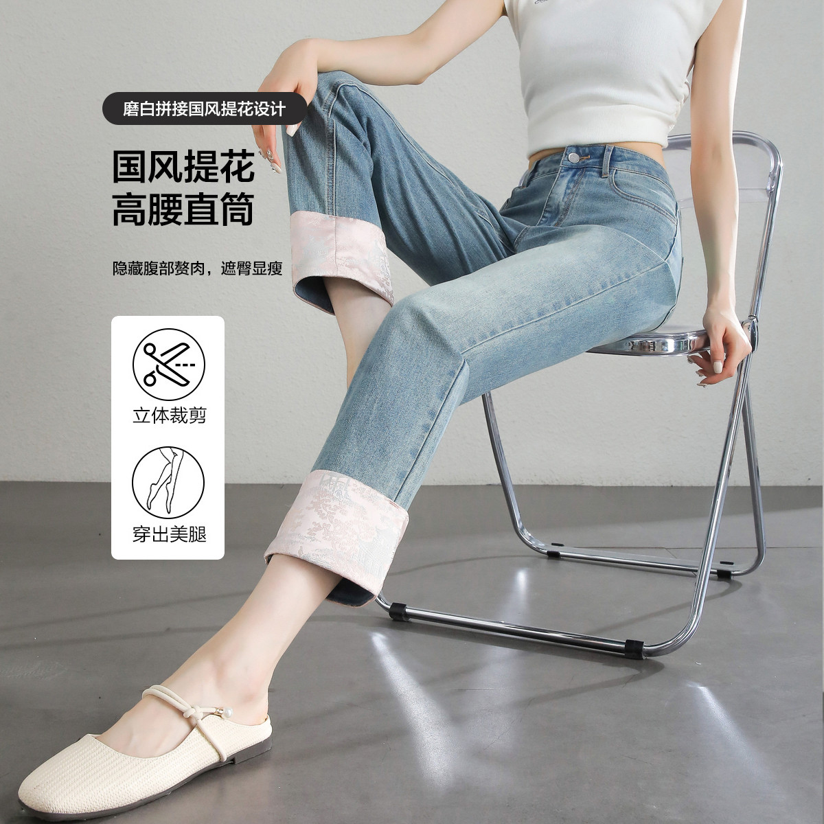 【筷子腿系列】夏高腰显瘦做旧磨白拼接国风提花直筒九分牛仔裤 268801