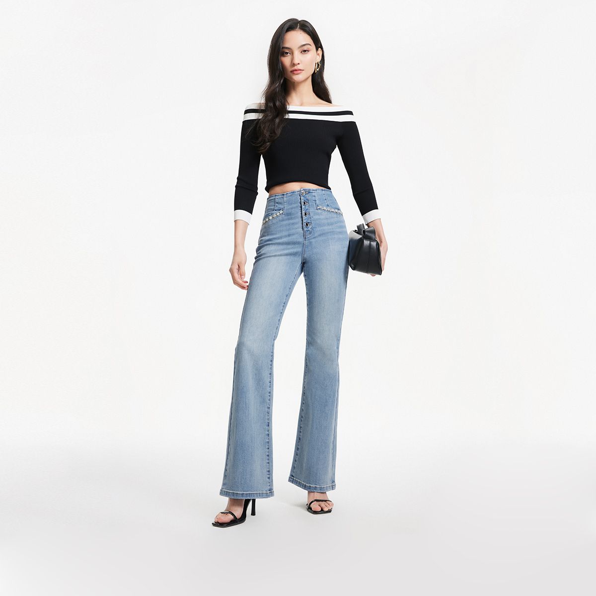 【水钻装饰】牛仔裤女春夏复古水洗磨白高腰水钻微喇长裤 755921