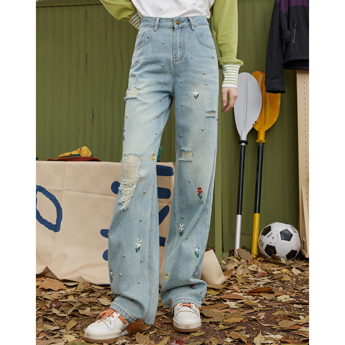镂空爱心宽松牛仔裤女春秋季设计感小众拼色阔腿裤子 257747