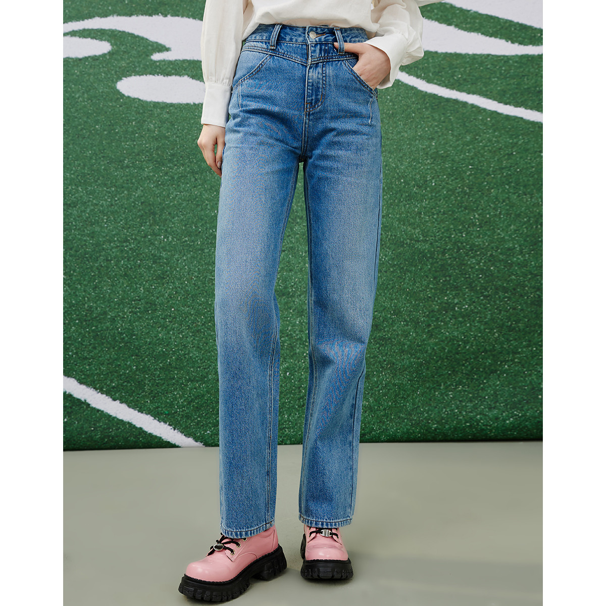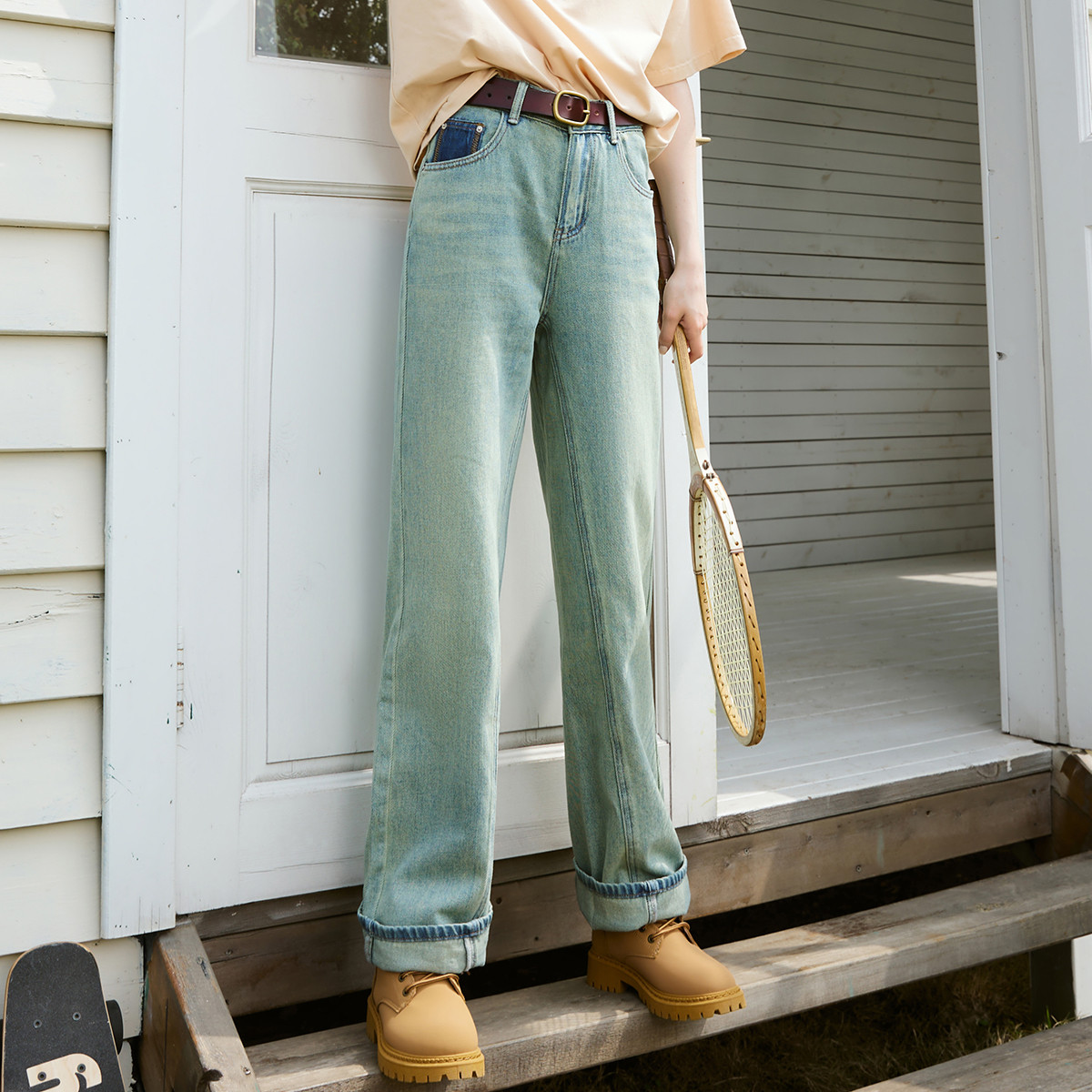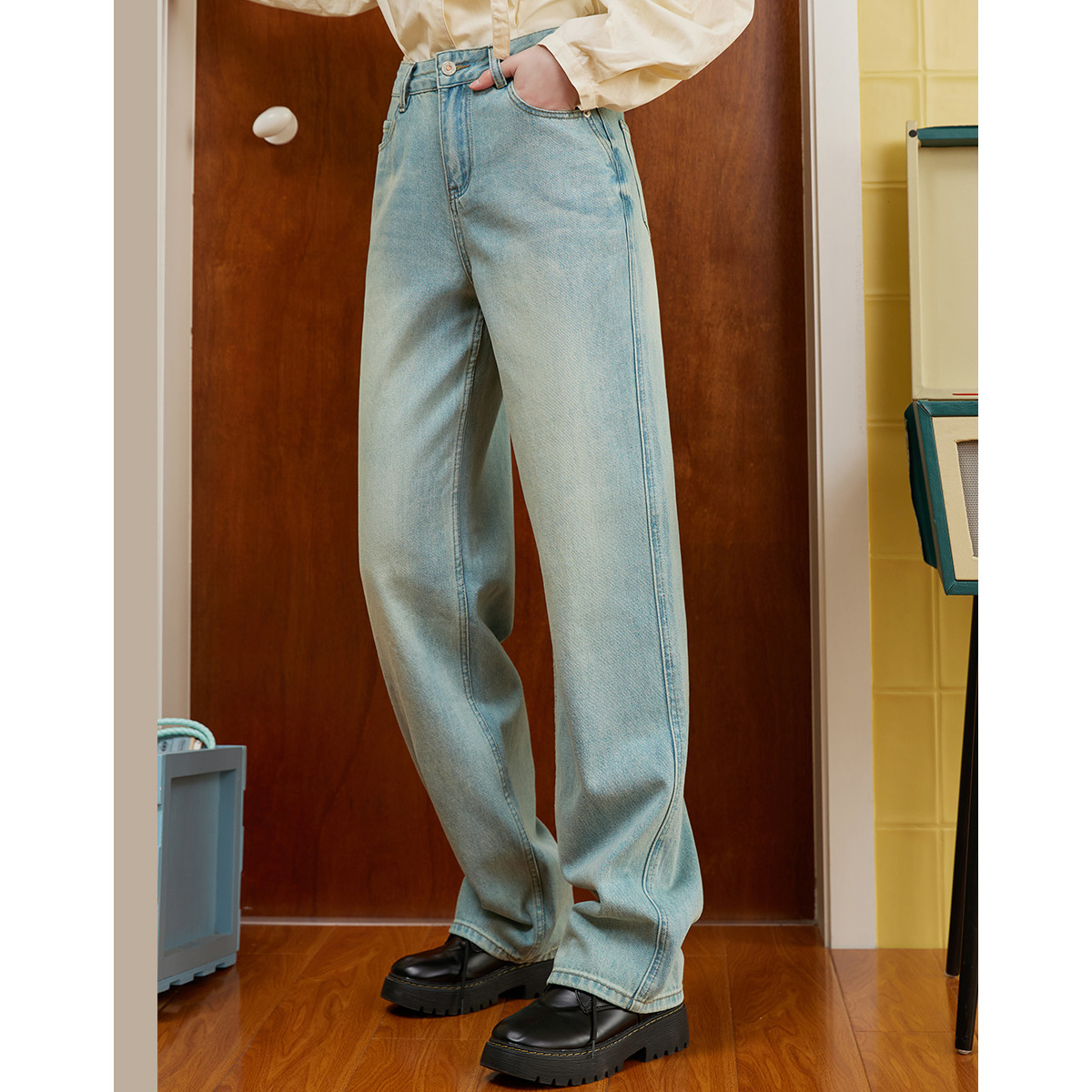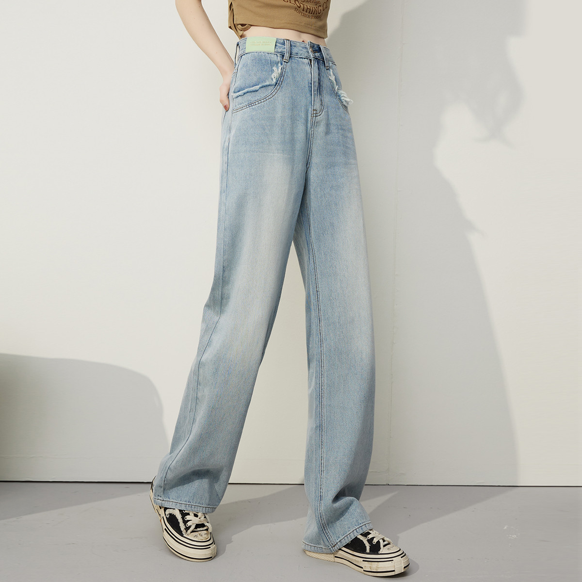 浅色经典款水洗做旧高腰直筒裤夏季休闲百搭女式牛仔裤 083869