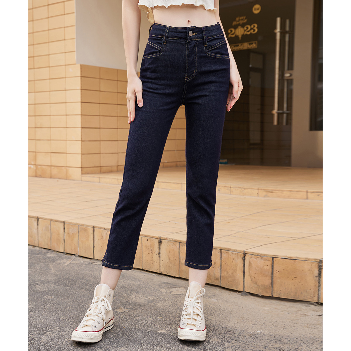 高腰休闲百搭经典款烟管裤春季街头风简约设计女式牛仔裤 230493