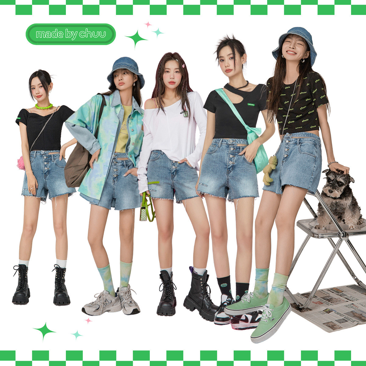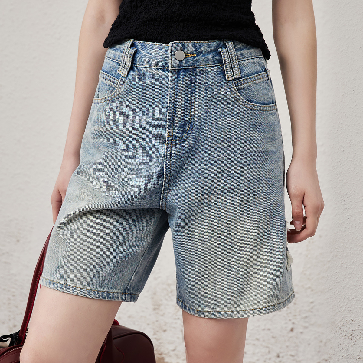 CHUU镂空高腰破洞牛仔裤女夏季设计感排扣宽松短裤 180435