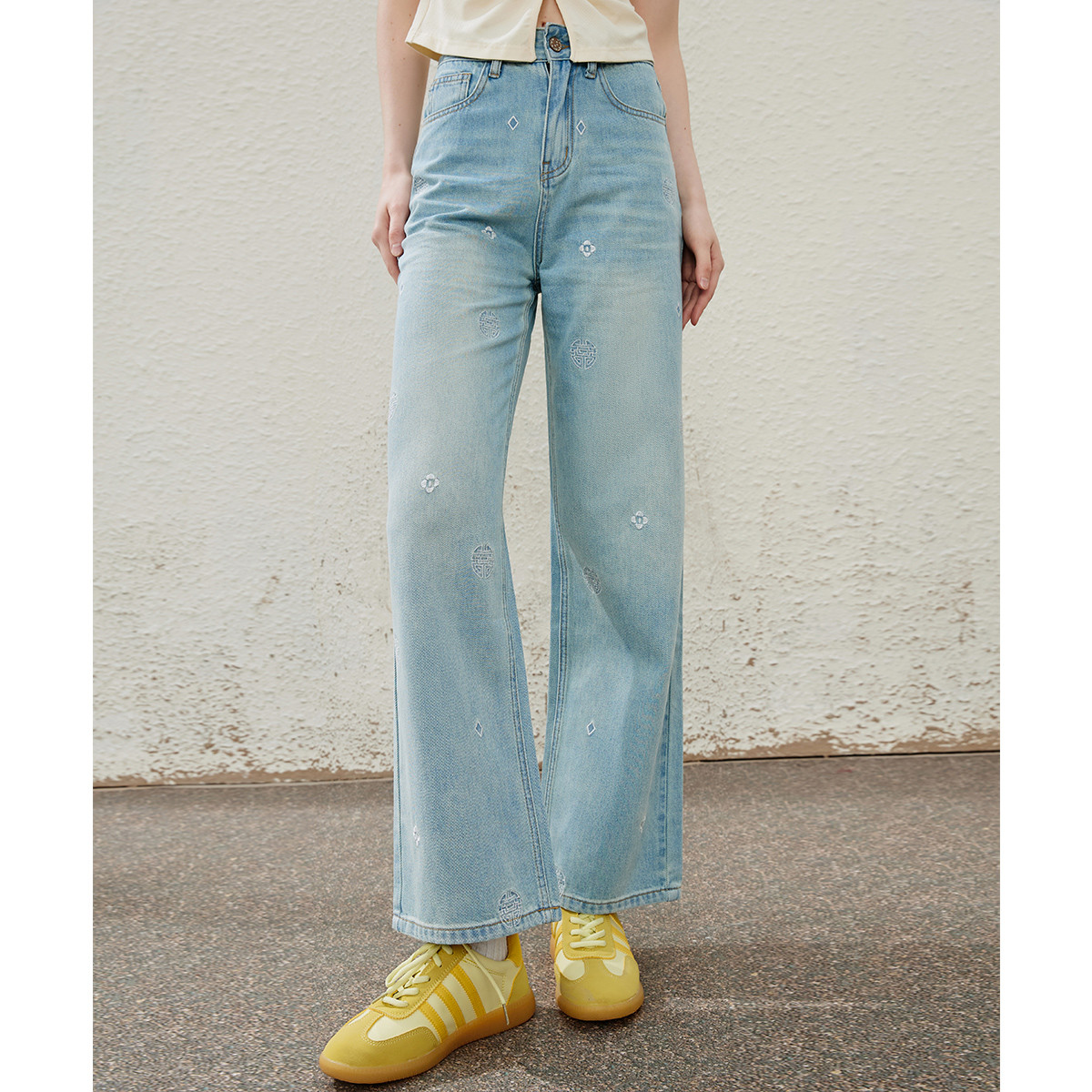 中国风刺绣设计感高腰百搭阔腿裤夏季个性气质女式牛仔裤 900189