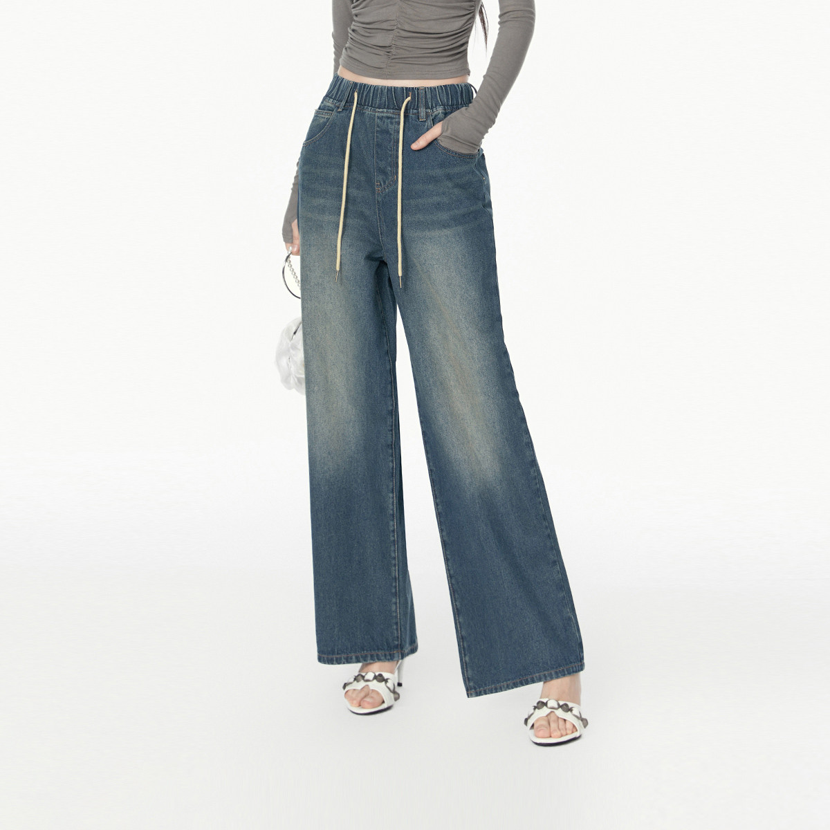 春秋时尚休闲松紧带设计感牛仔裤女宽松直筒长裤 672660