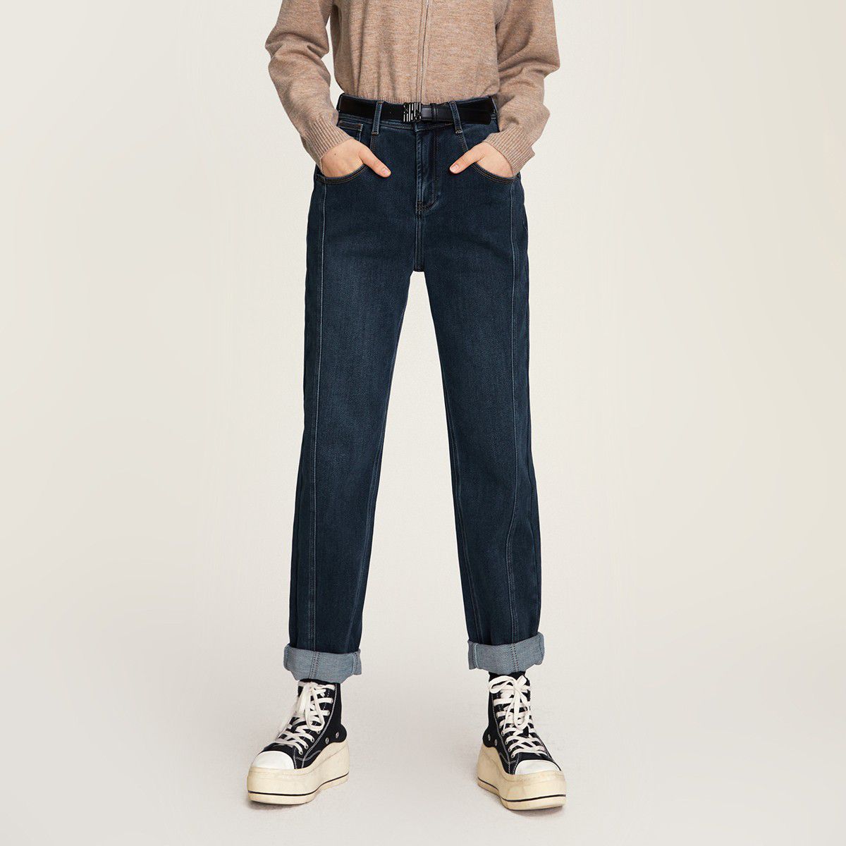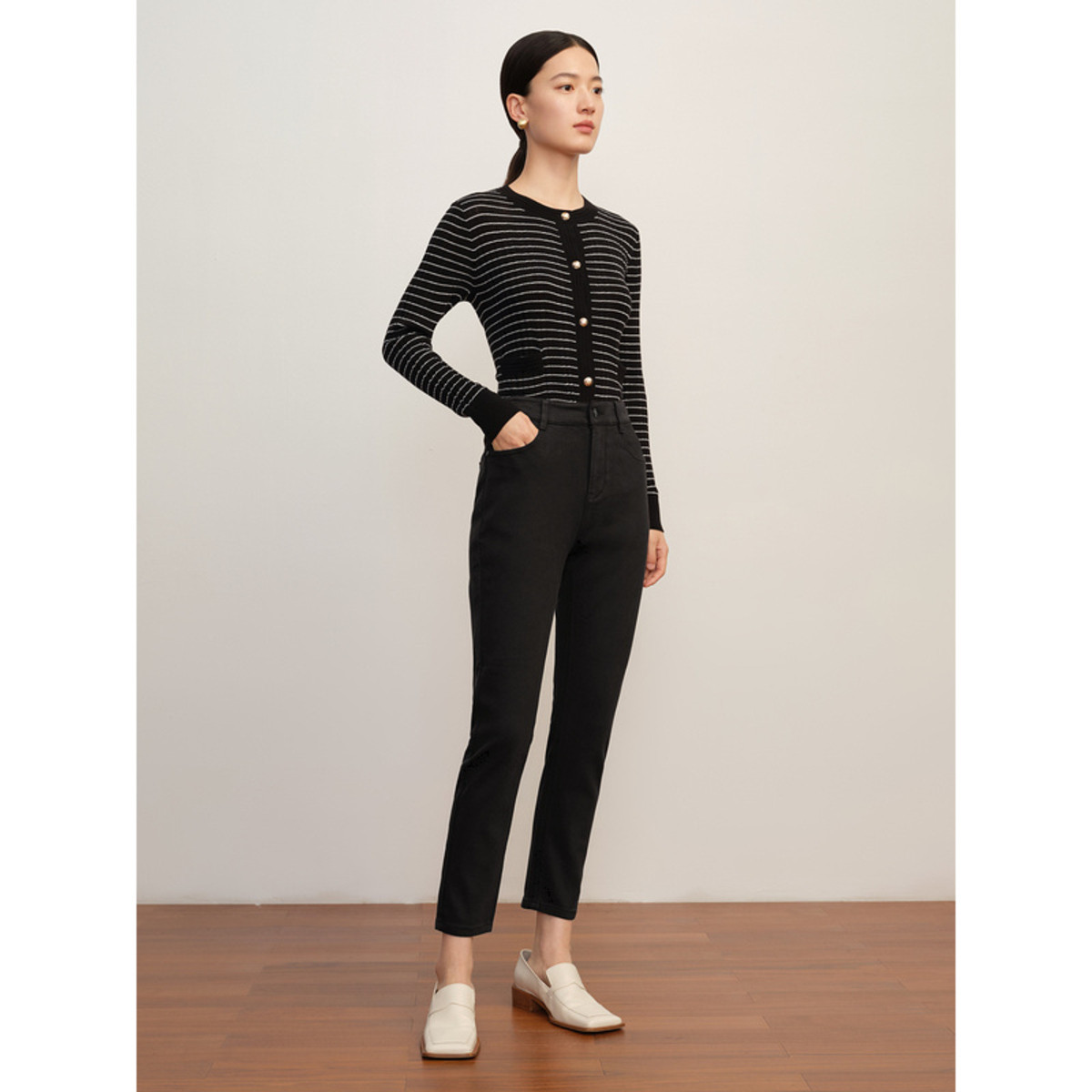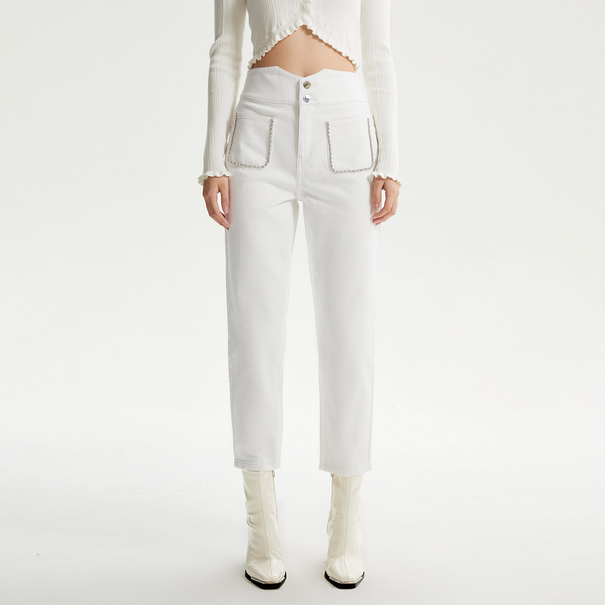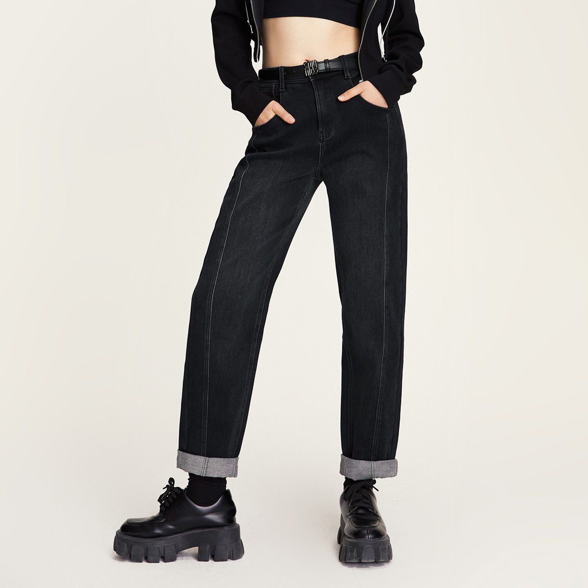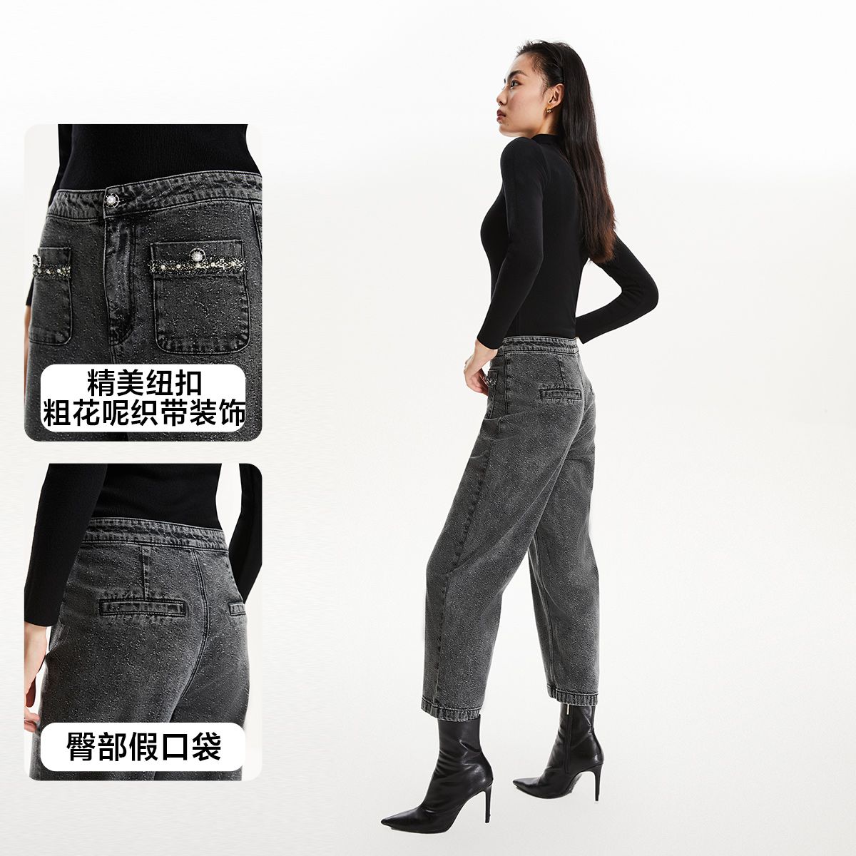 玖姿旗下安娜蔻系列丹宁高腰热力岩牛仔裤长裤小脚裤女冬季 406156