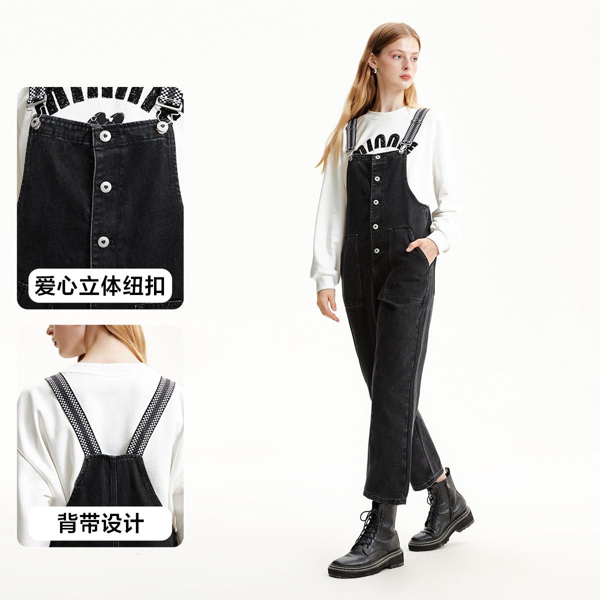 【专柜】春夏背带裤直筒七分裤休闲简约牛仔裤女气质百搭时尚 303825