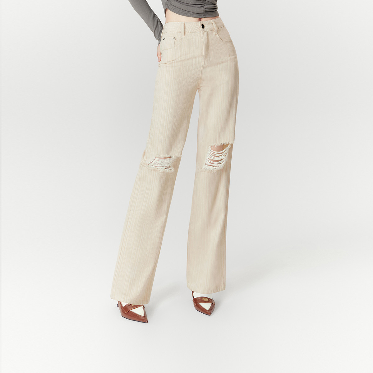 春秋高腰显瘦条纹破洞卡其色牛仔裤女百搭直筒裤 869140