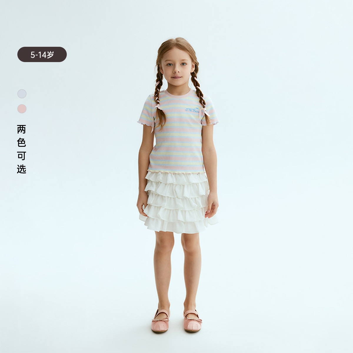 巴拉巴拉儿童短袖女童t恤夏装中大童波浪边飞袖甜美印花上衣时尚 804165
