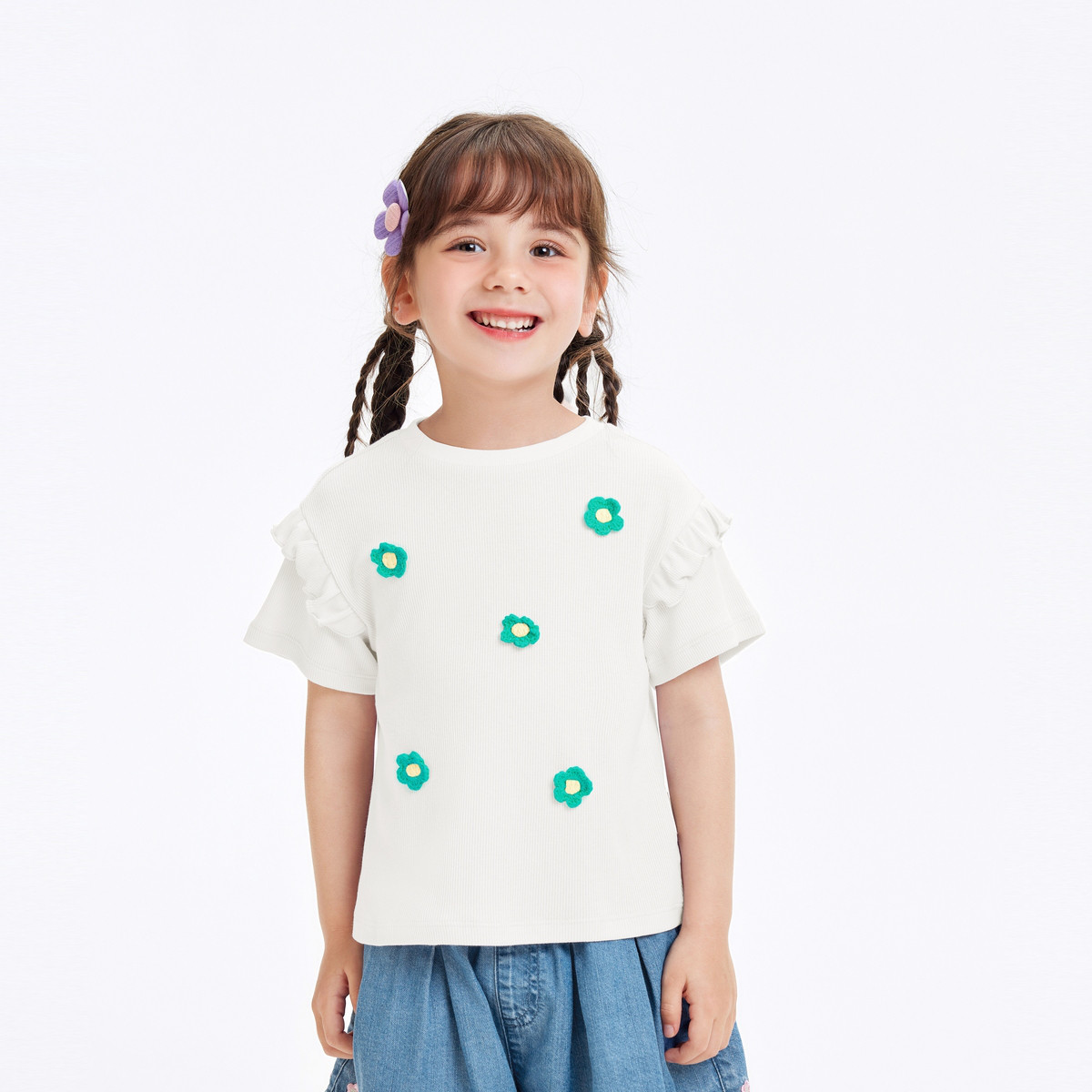 巴拉巴拉儿童短袖女童t恤夏装中大童波浪边飞袖甜美印花上衣时尚 804165
