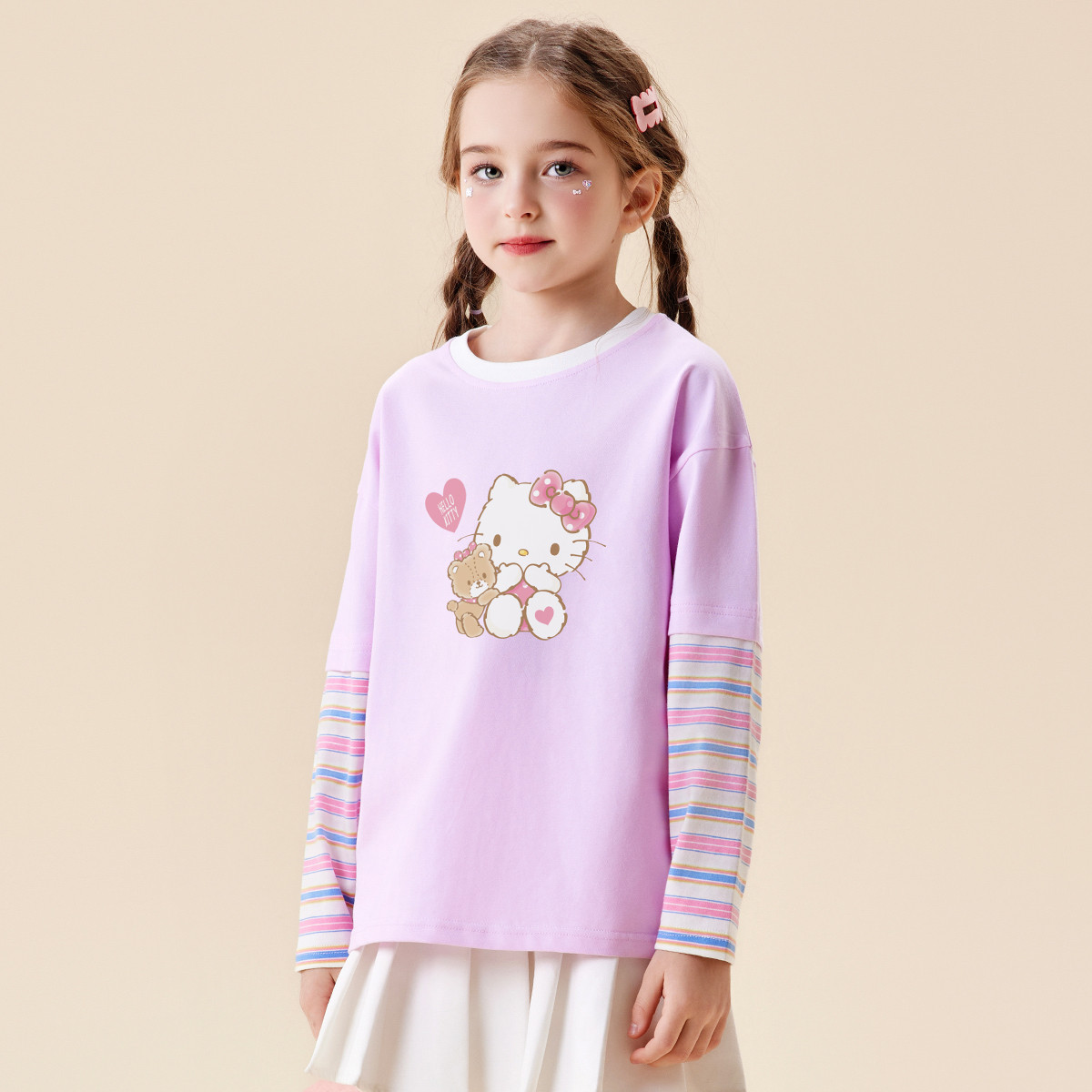 女童春季假两件T恤2025款中大童春春装女宝长袖条纹T恤上衣 634462