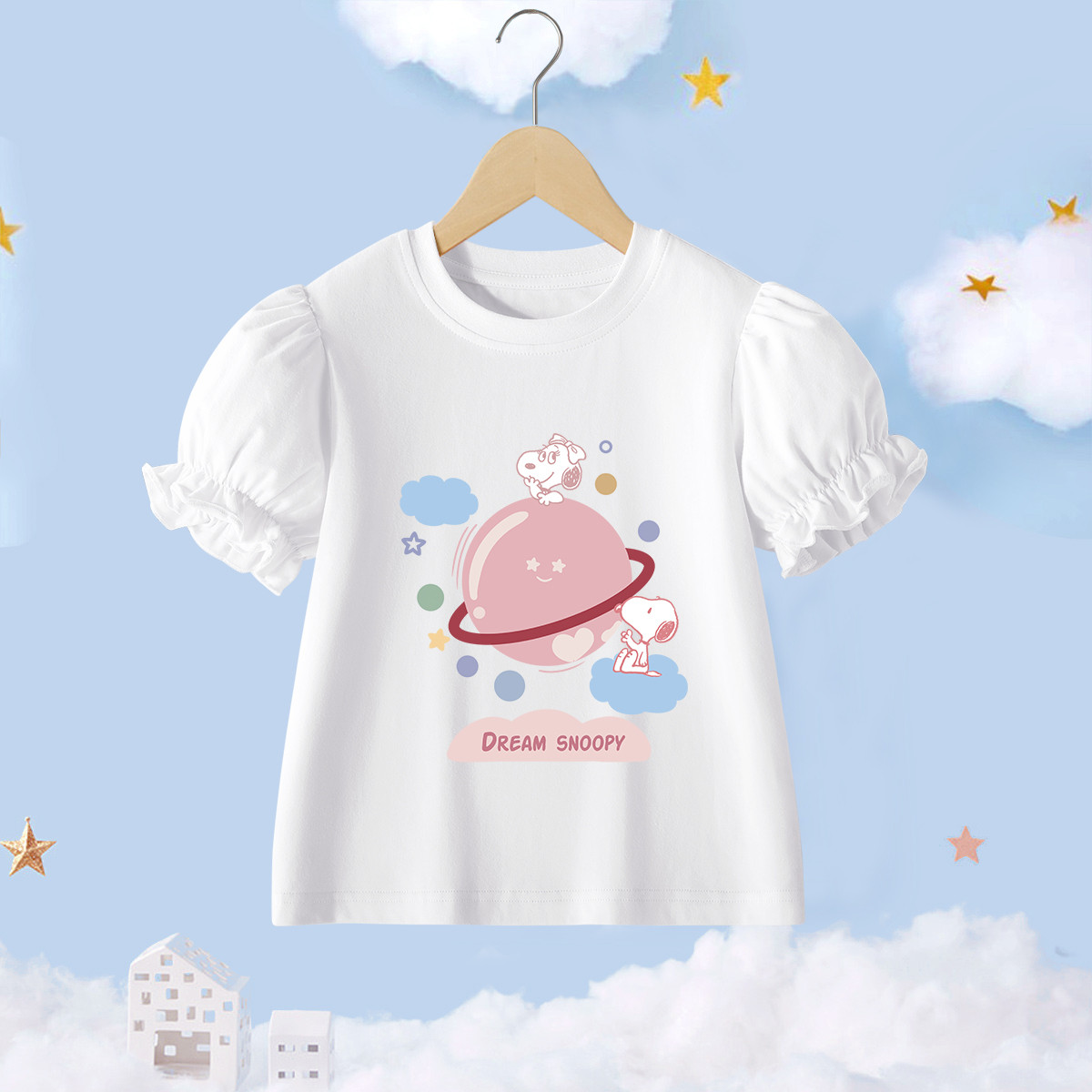 童装女童圆领短袖上衣25夏新款简约时尚女孩甜美泡泡袖纯棉T恤 357599