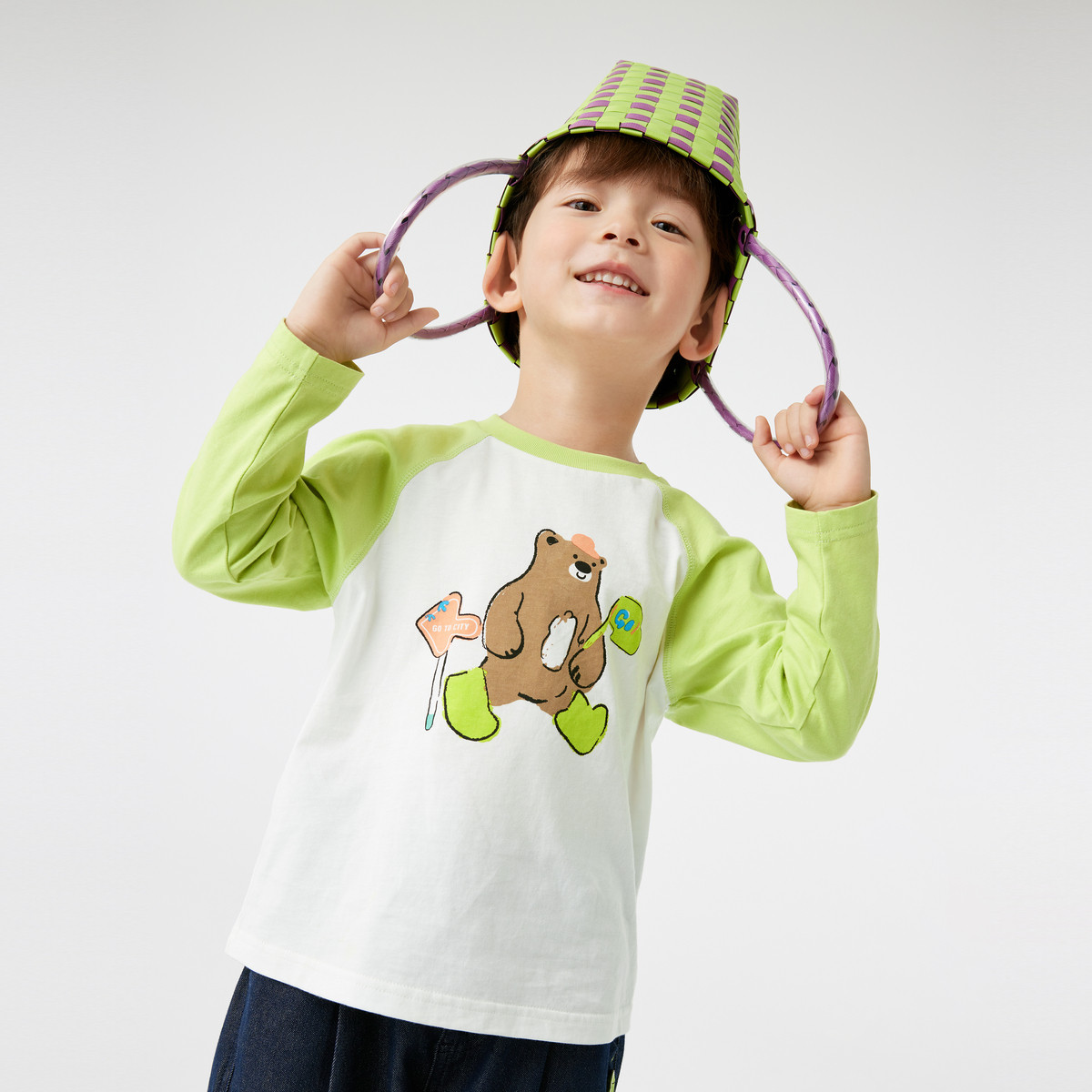 小熊童装春秋款男女童撞色插肩长袖T恤 748417