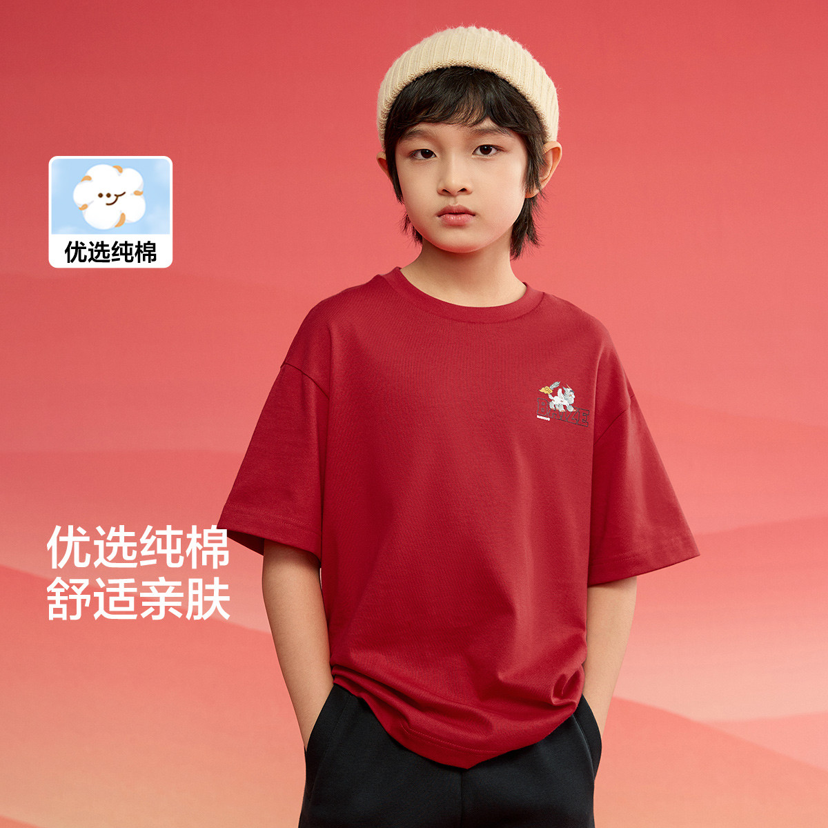 亲子国风儿童短袖T恤夏男童女童棉红色轻薄透气家居服圆领打底衫 650501
