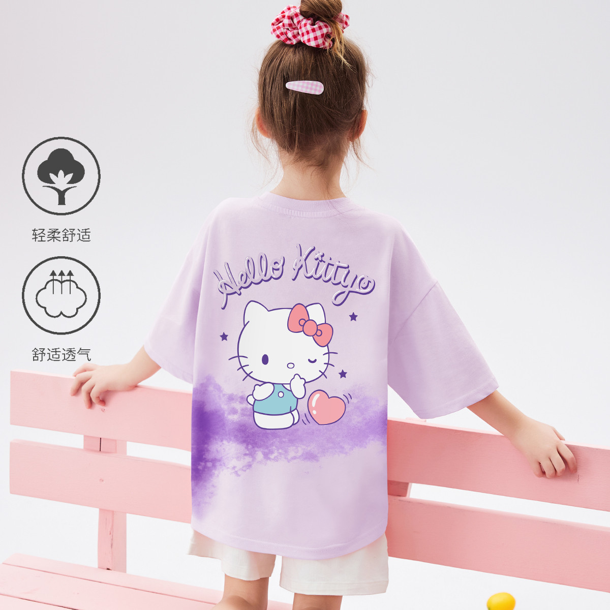 女童夏季短袖T恤2025款粉色撞色晕染效果卡通印花中大童上衣 515870