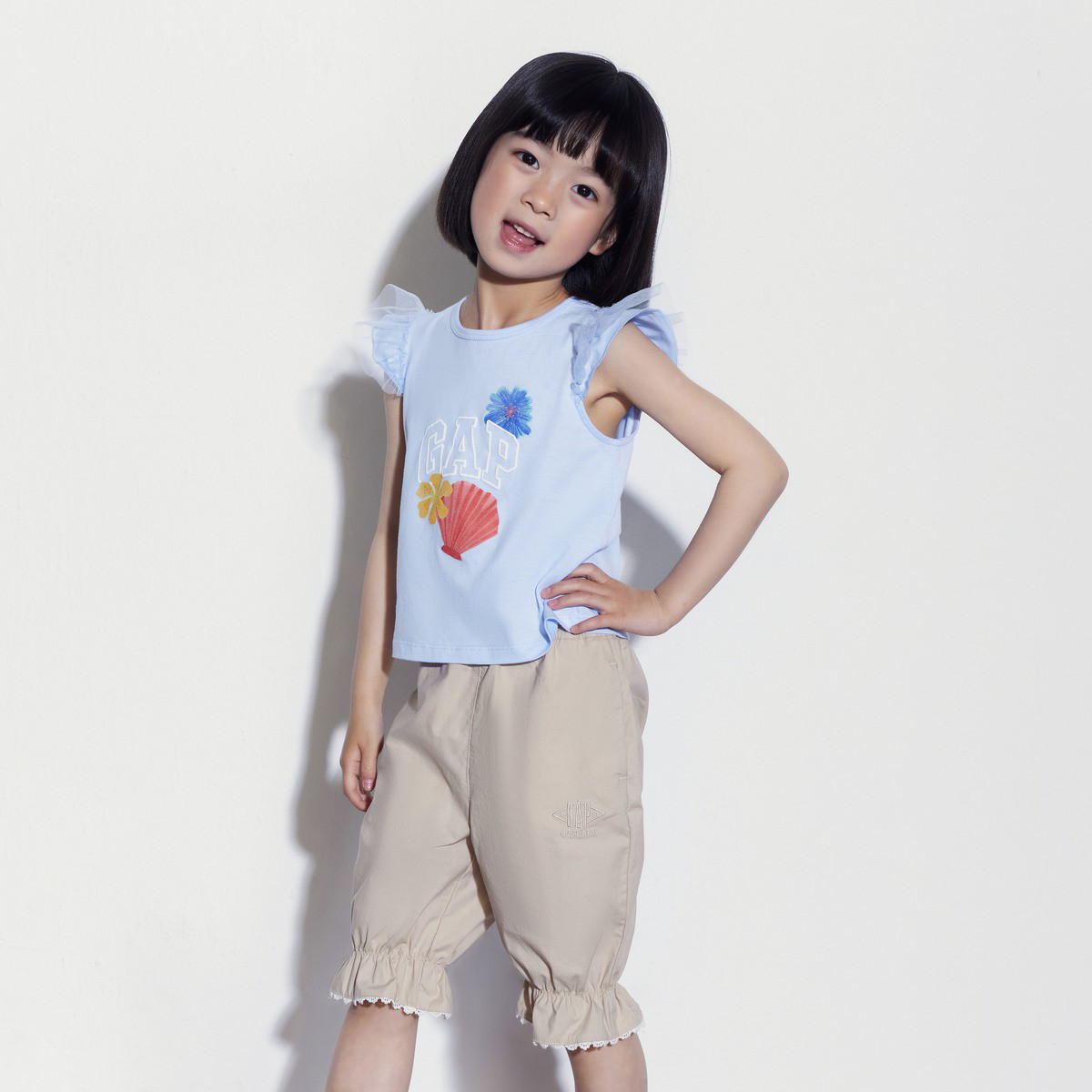 Gap女幼童2024春秋季荷叶边网纱小飞袖印花短袖T恤上衣466778 115482