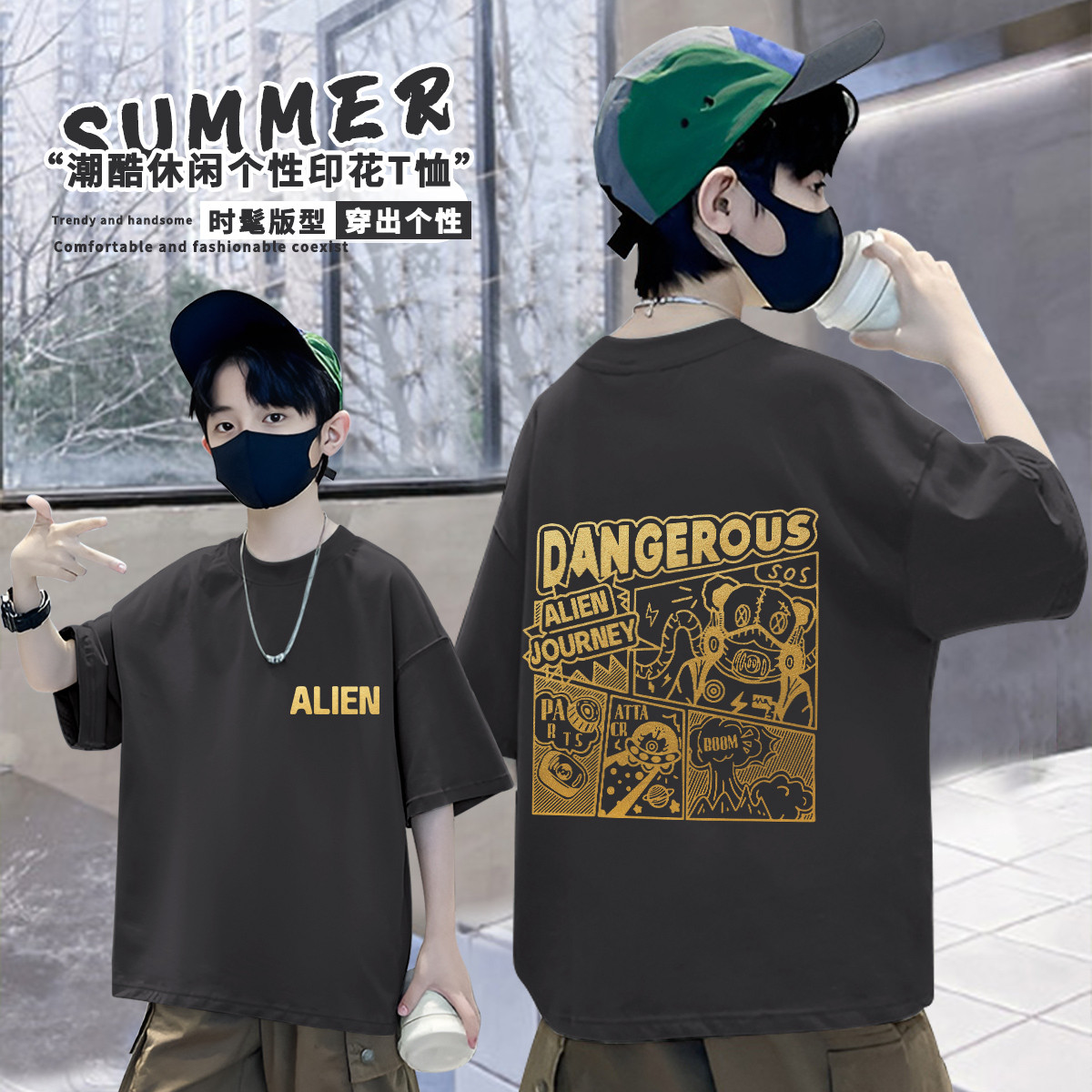 2025夏季男童纯棉短袖T恤时尚潮流中大童休闲宽松运动上衣 353119