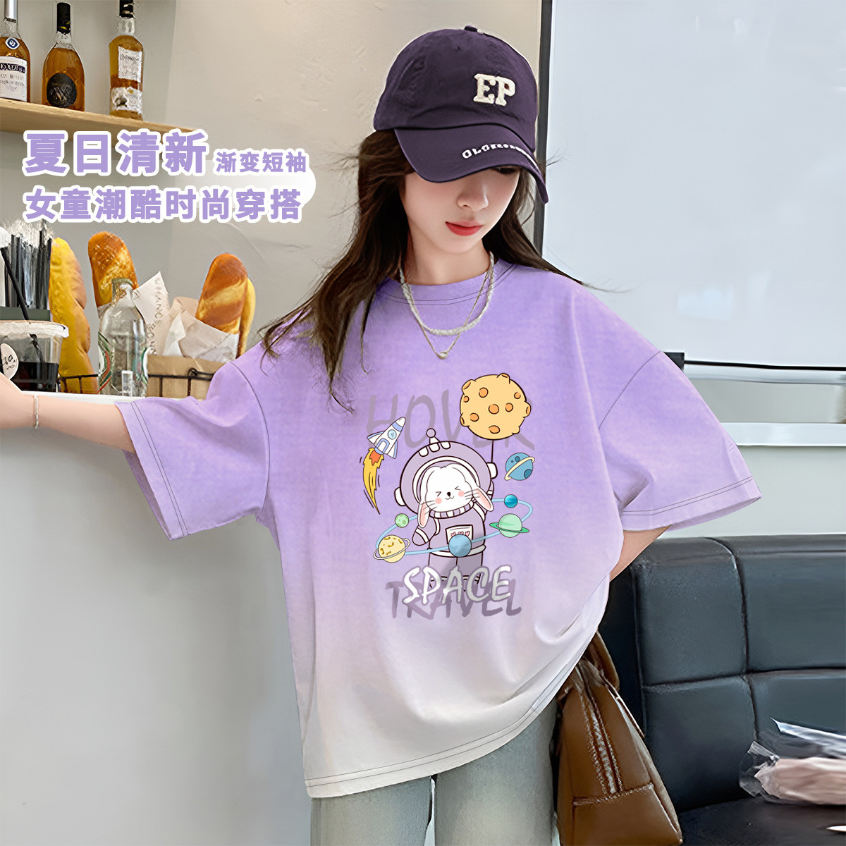 女童纯棉渐变短袖2024春秋季儿童亲肤透气时尚甜美短袖上衣 442255