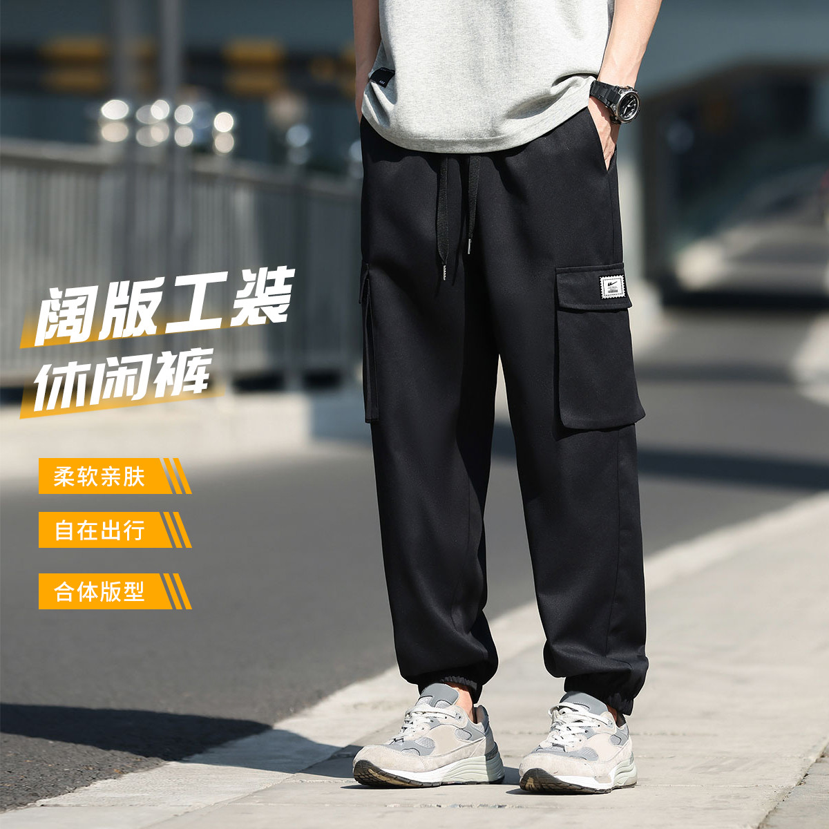 男款夏季时尚束脚长裤男简约大口袋印花工装裤青年百搭休闲长裤子 328019