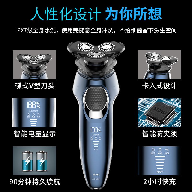 SID/超人 理容剃须刀干湿两用1小时快充全身水洗USB车载充电 RS385