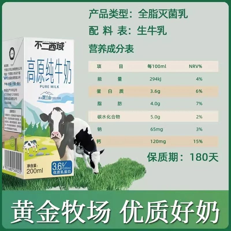 不二西域高原纯牛奶200ml*12盒*3箱